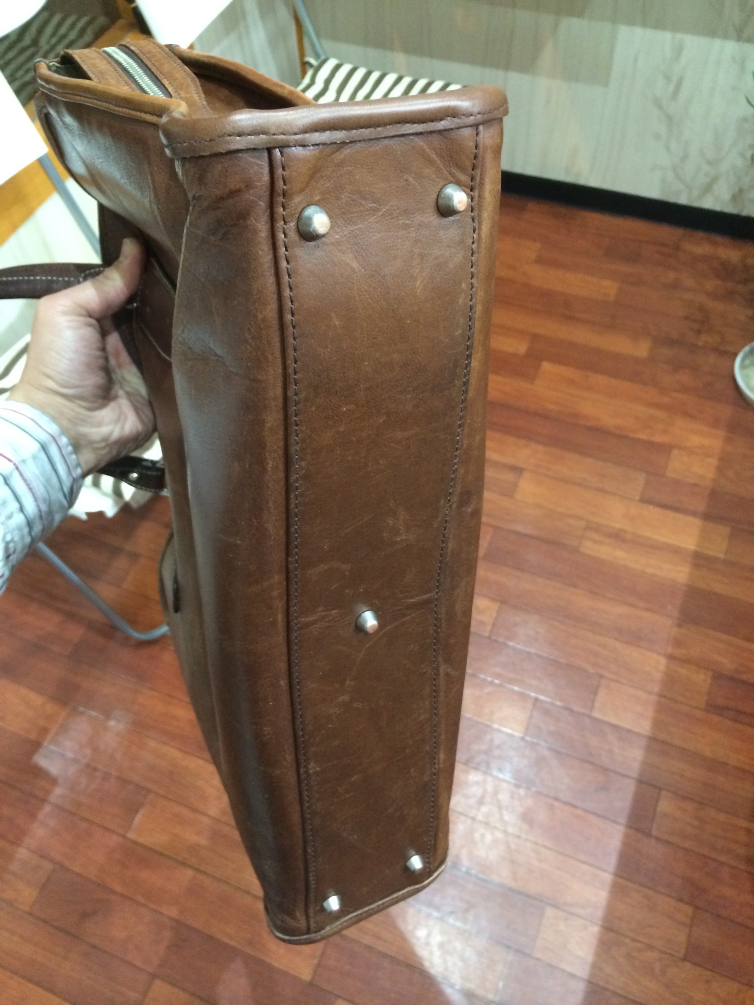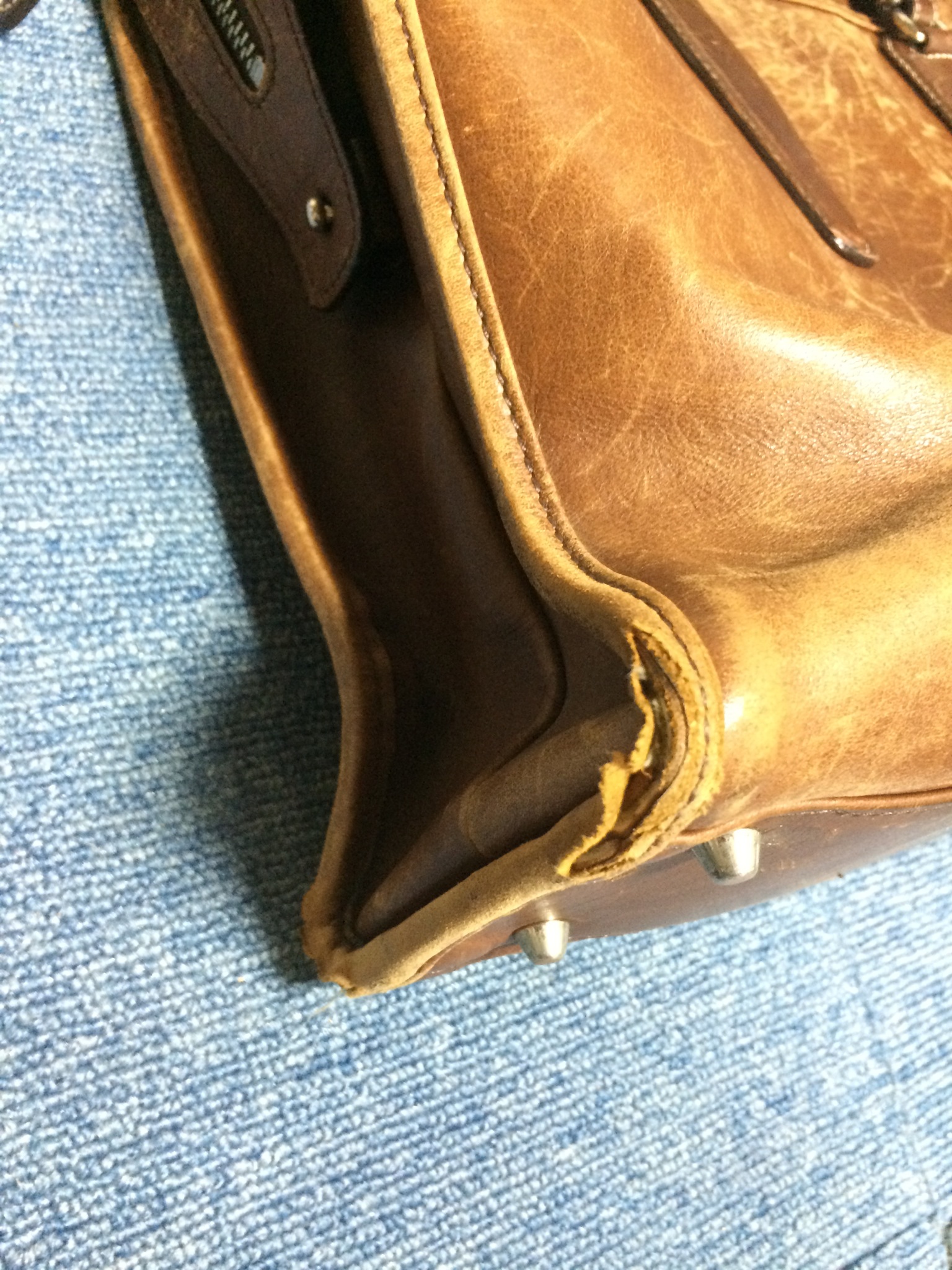 今回はビジネスバッグの底 革当て補修です。