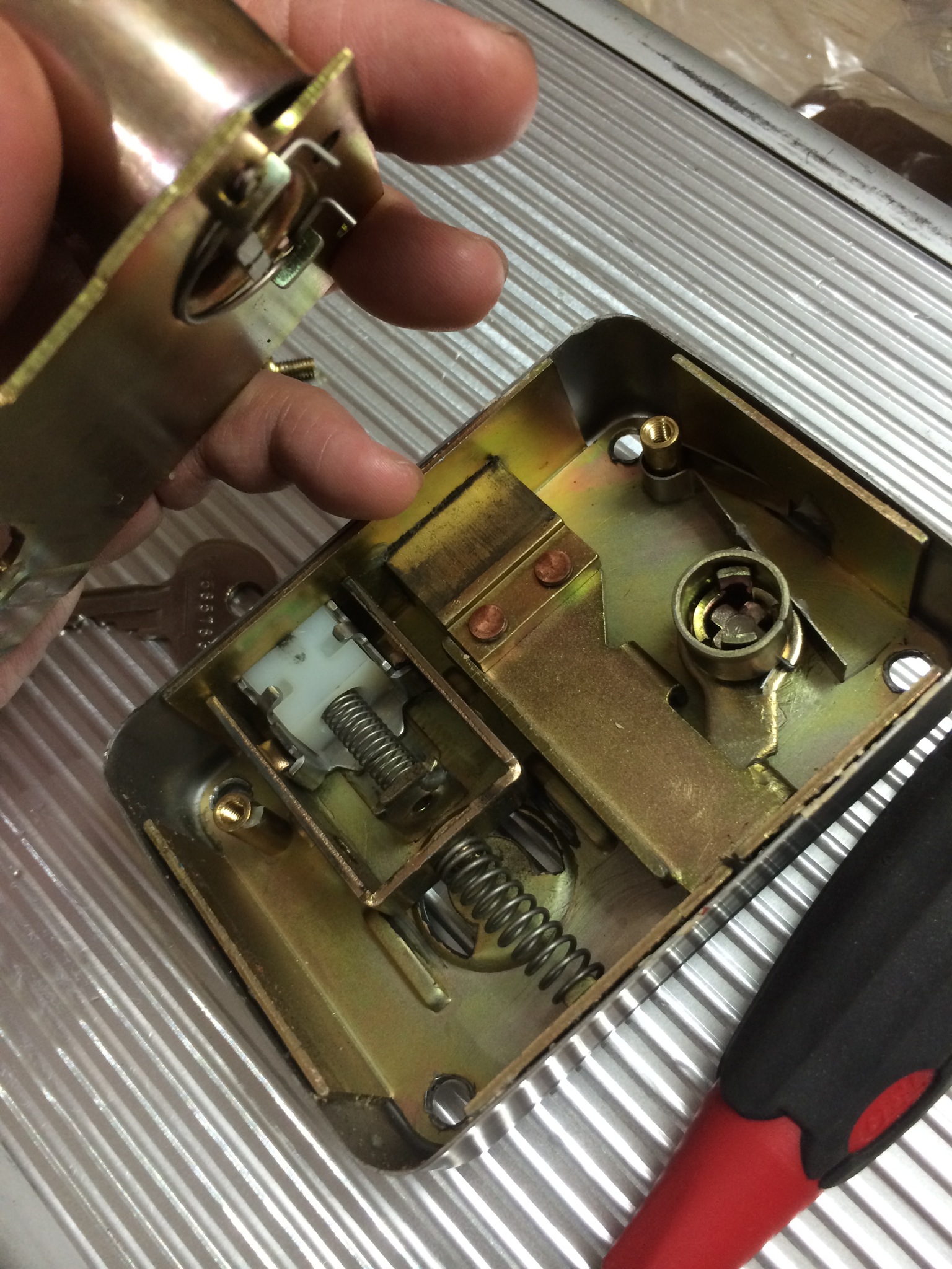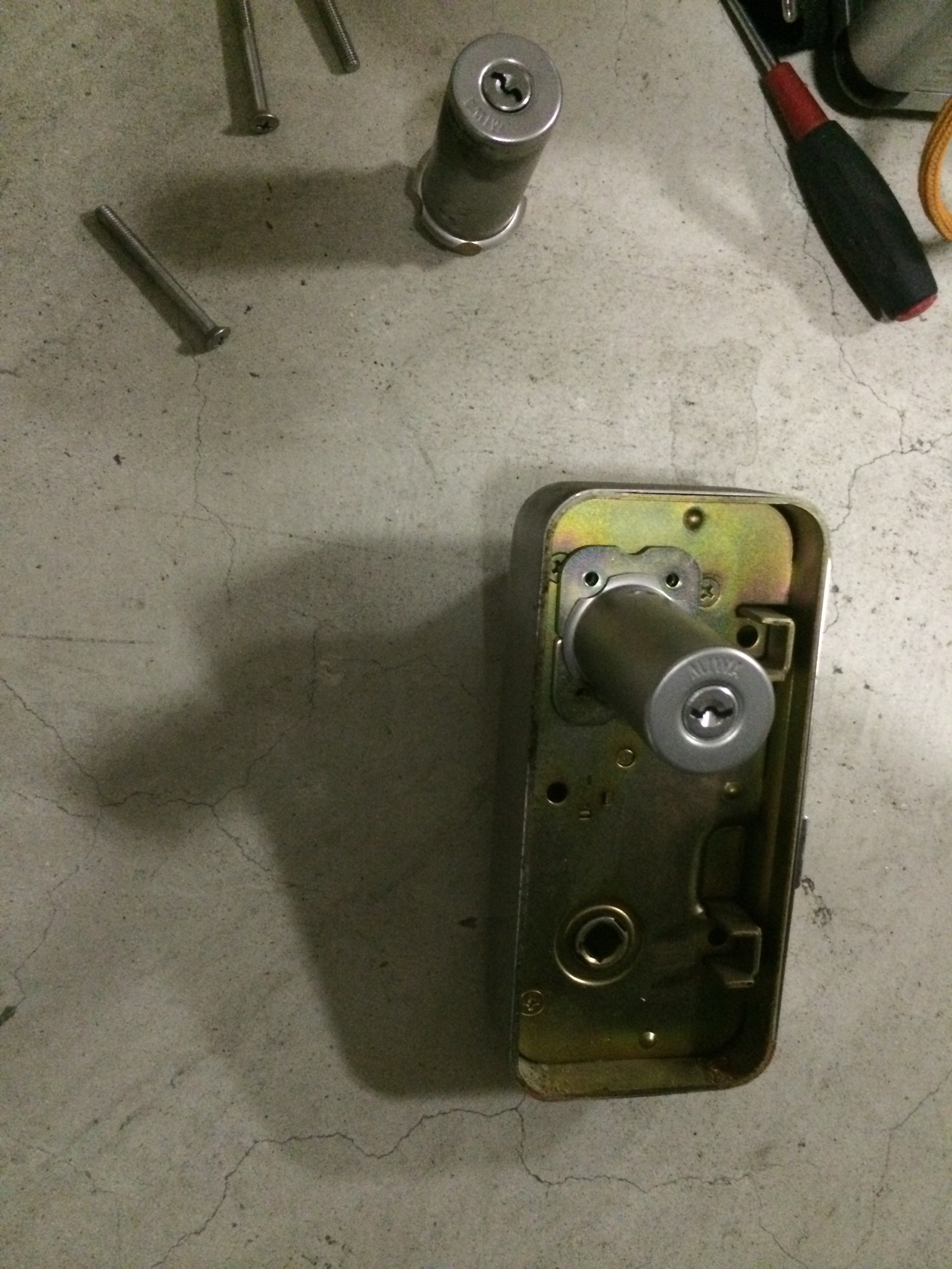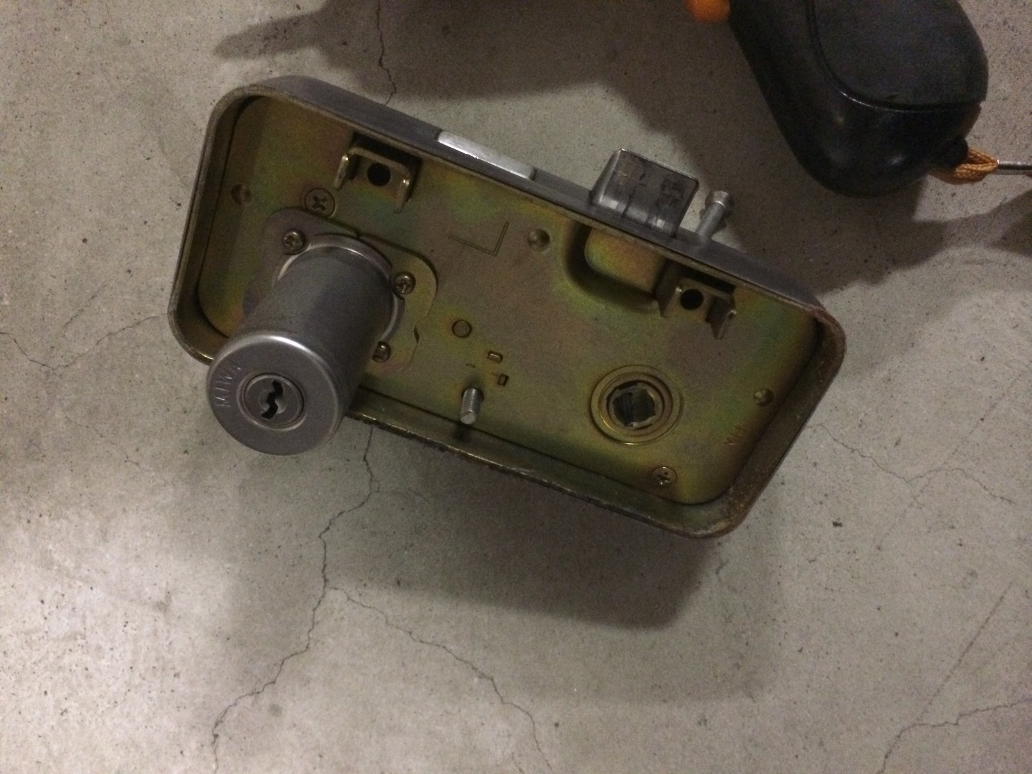 カギ穴のぞいててもラチがあかないので錠前をバラシていきます。