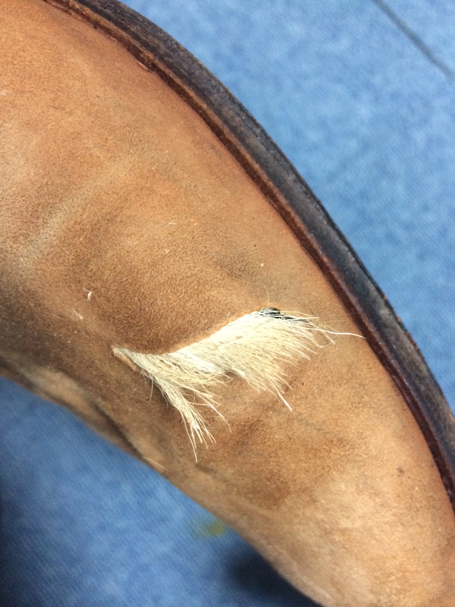 クリーニング→キズの周りの毛を散髪→裏から革貼って→完了です。