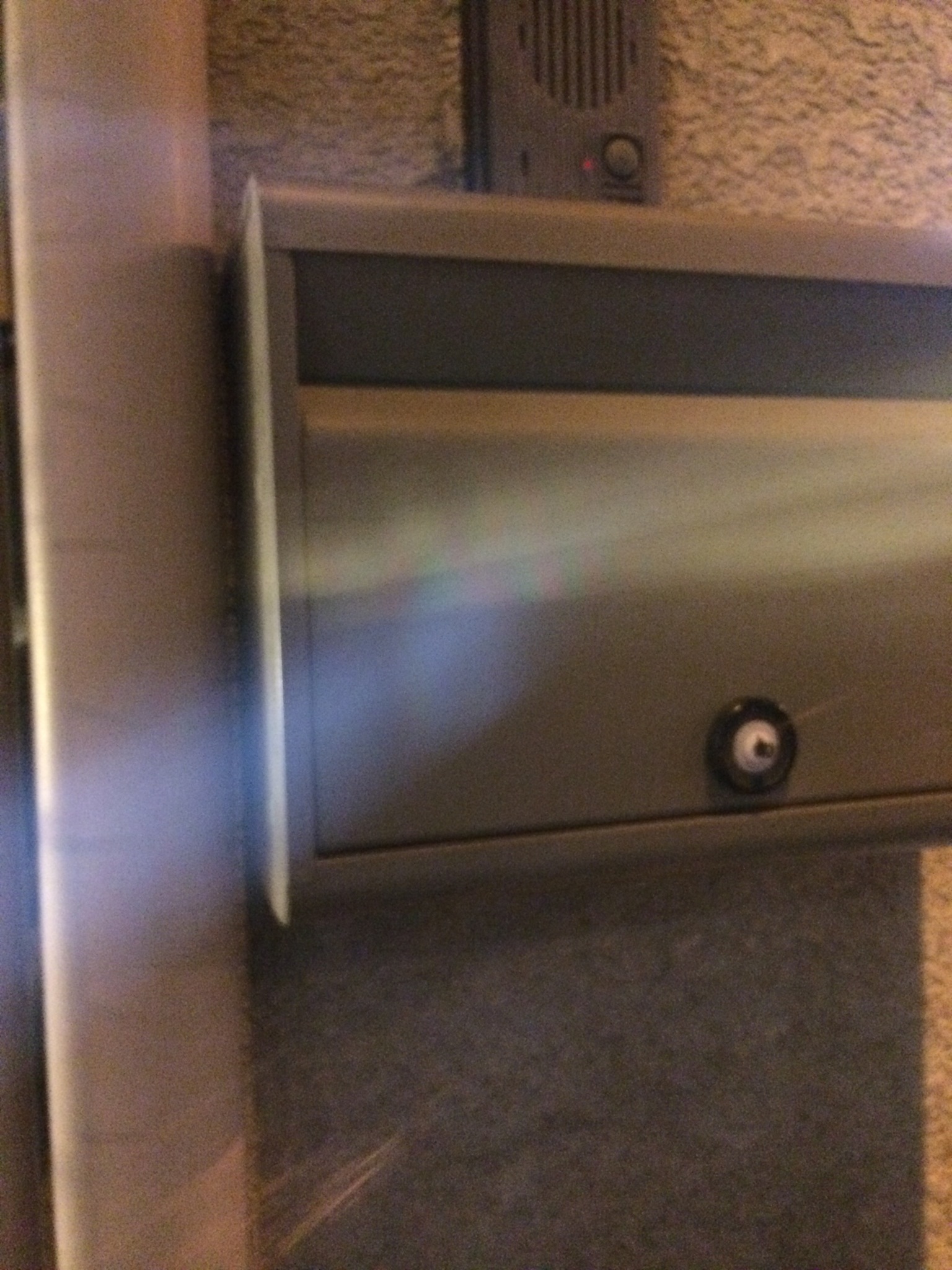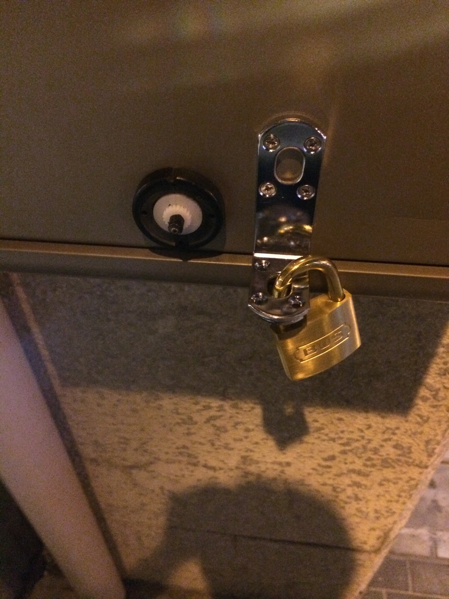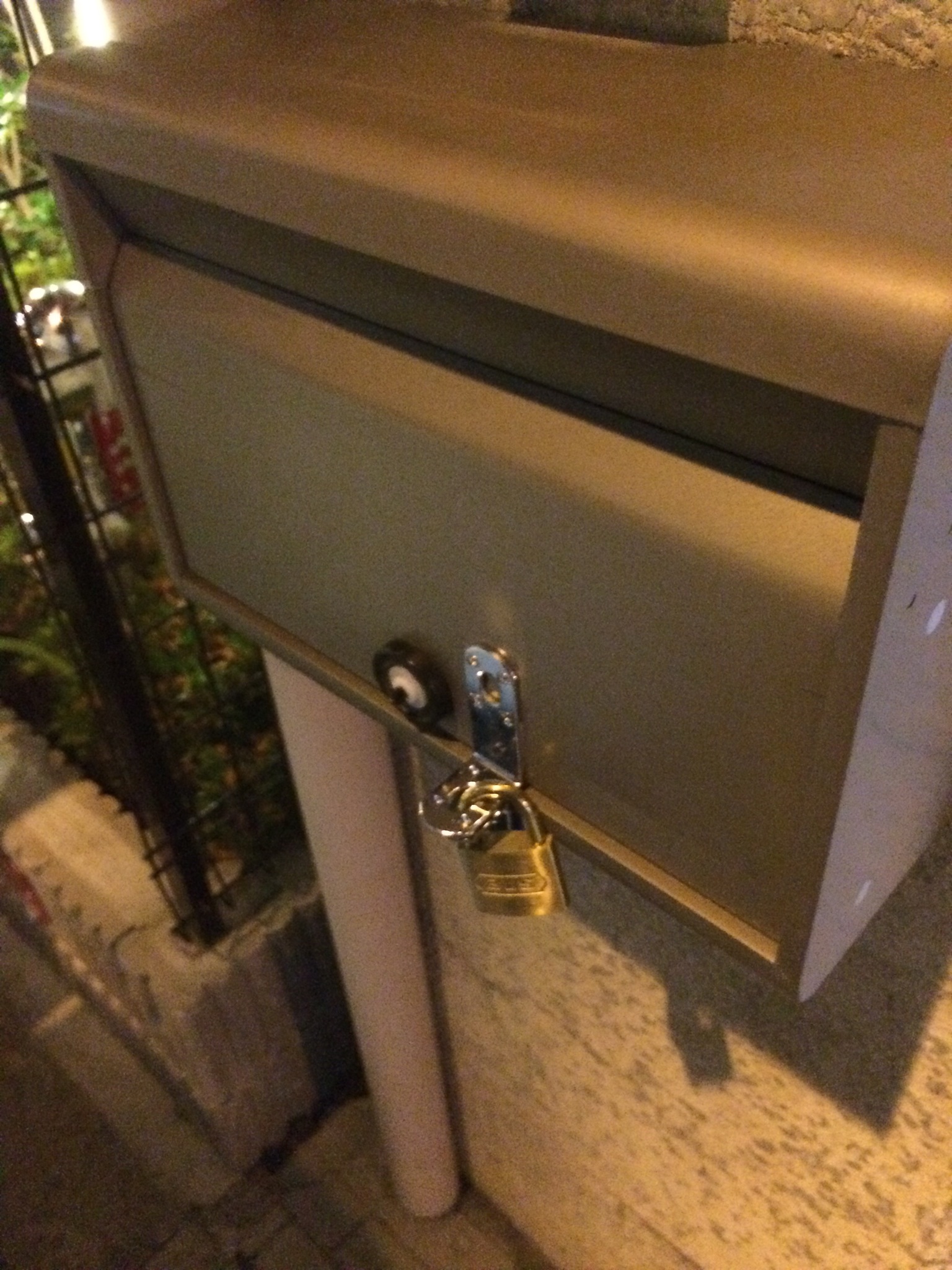 ポスト錠をいたずらで壊されたので、元のダイヤルはつまみとして残し、金具と南京錠で施錠するようにしました。