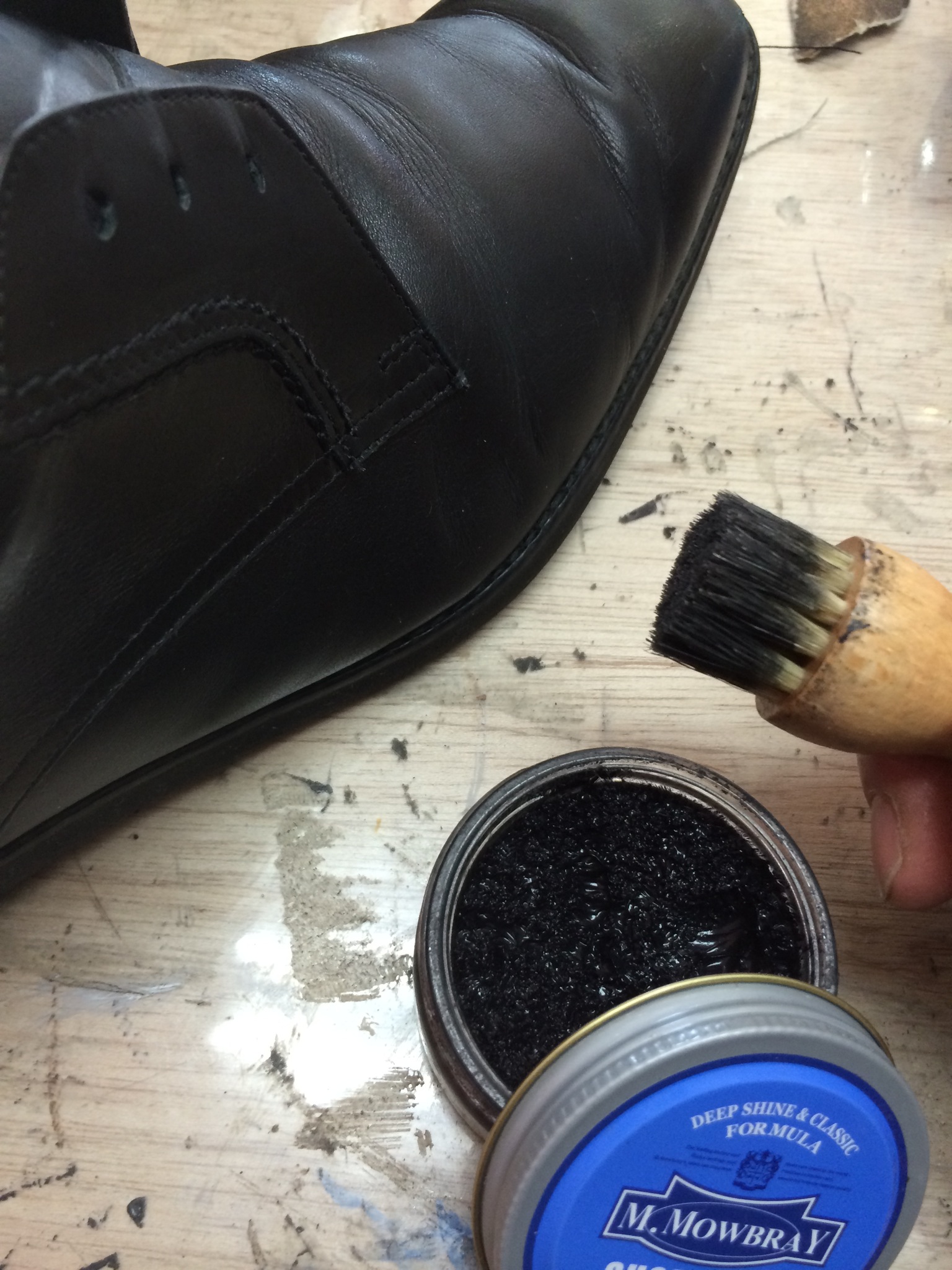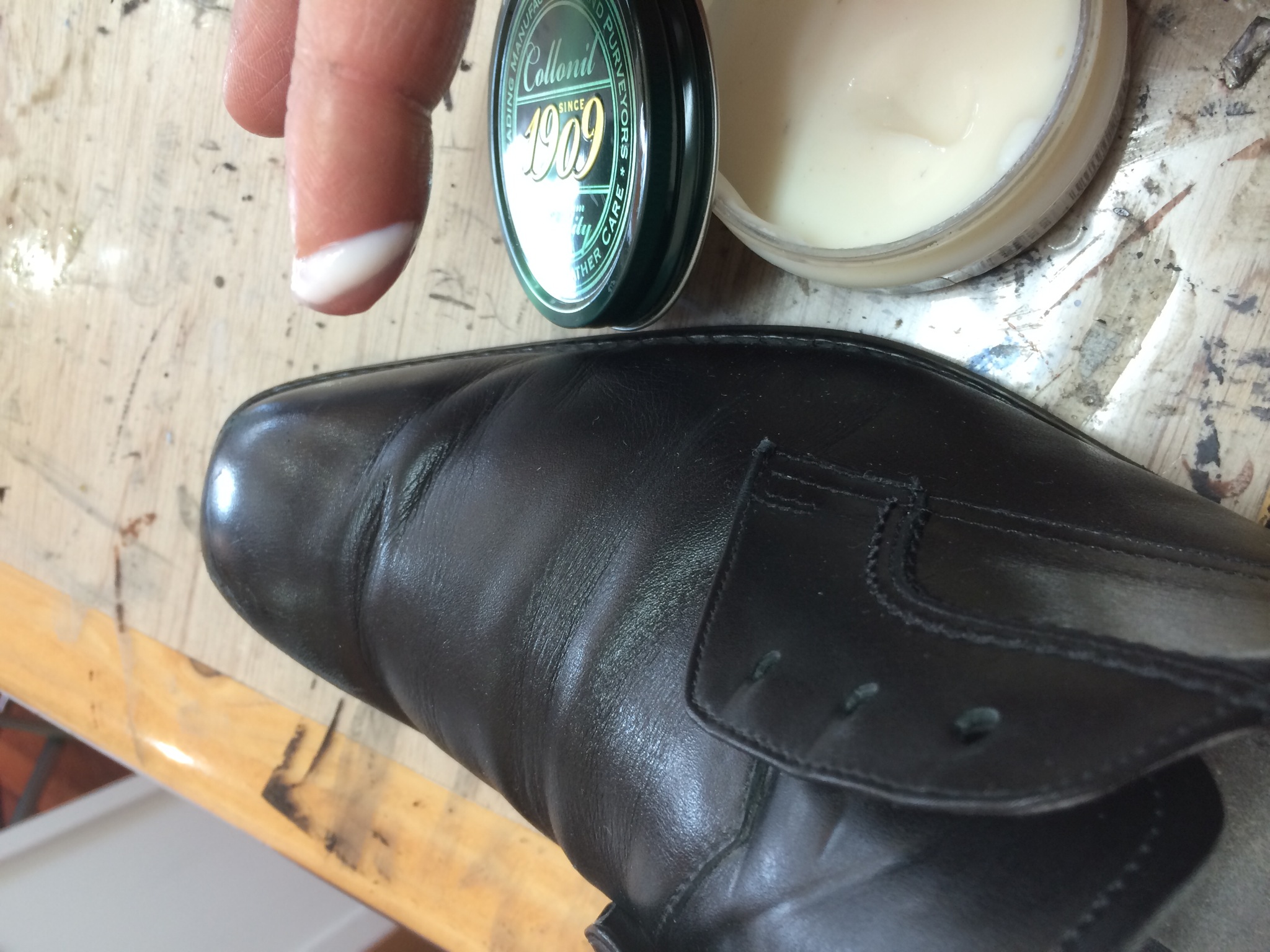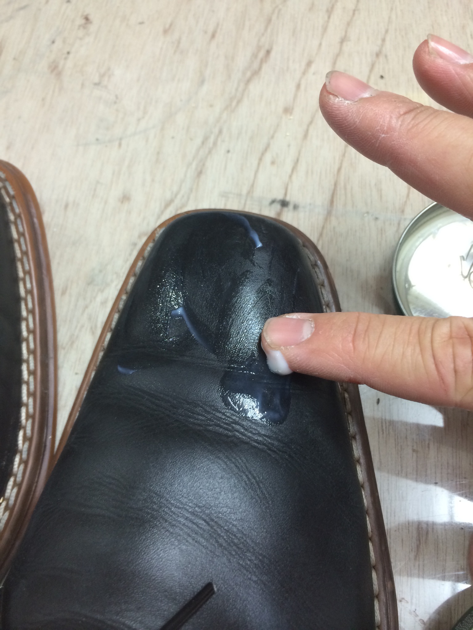 当店の革靴クリーニングの際は、高級保湿クリームをこんな感じでいれてから乳化性靴クリームで仕上げます!