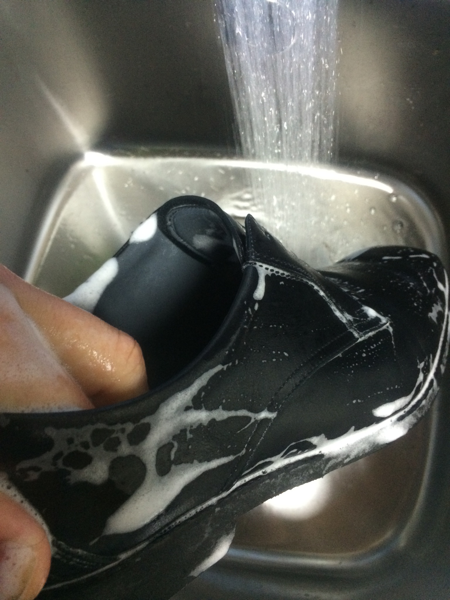 特別な洗剤をつかって優しく洗っていくと、革に親水性が戻り柔らかくなります。