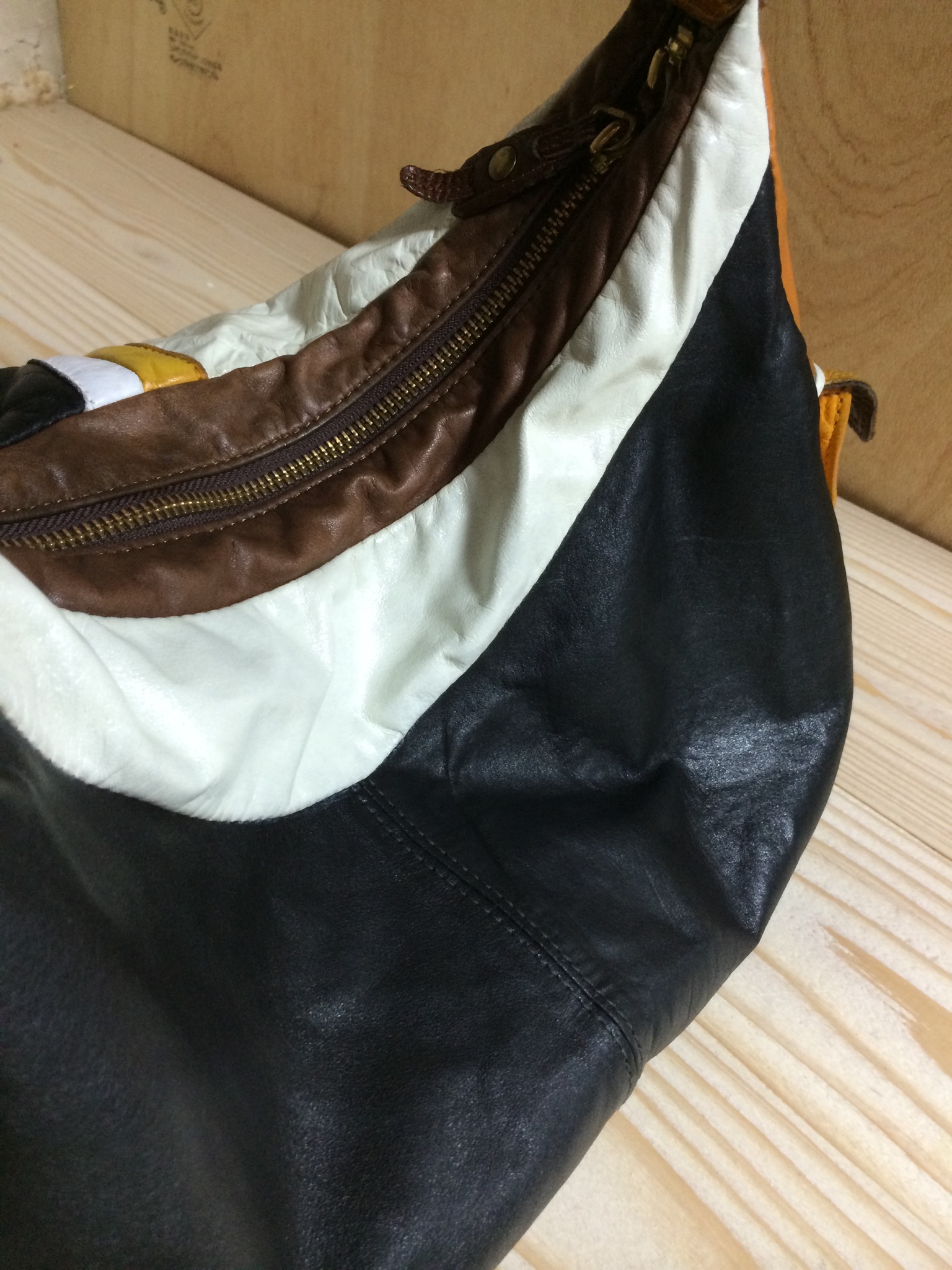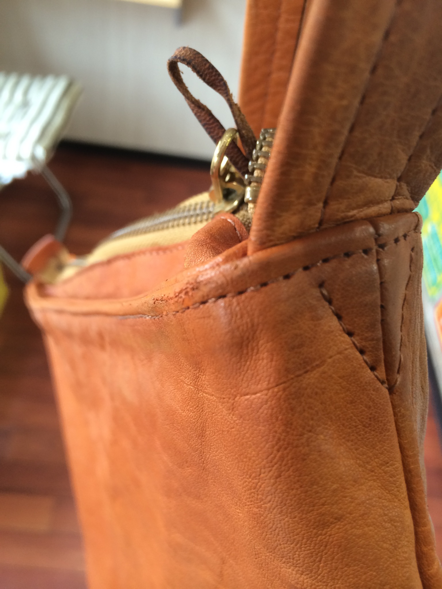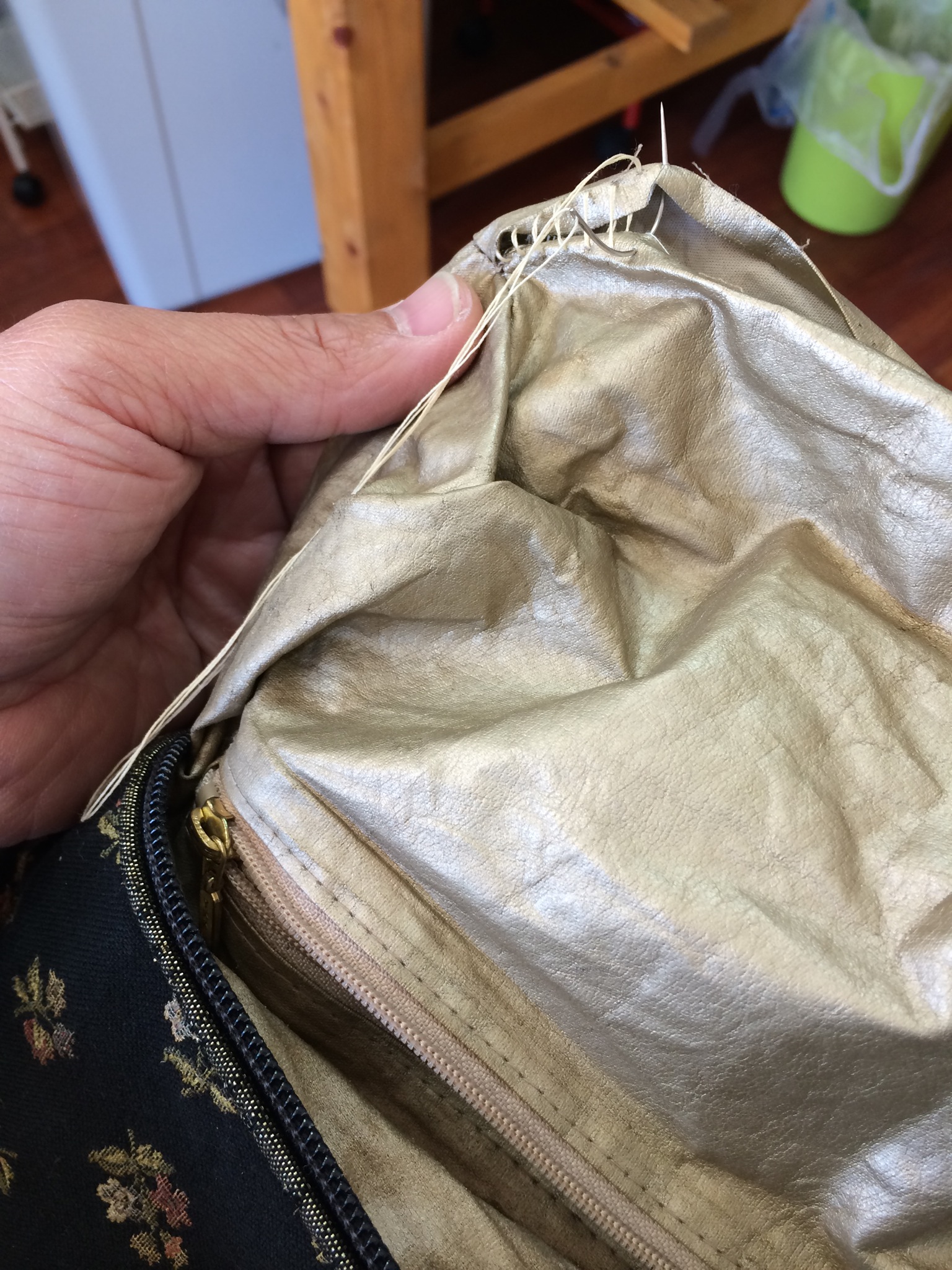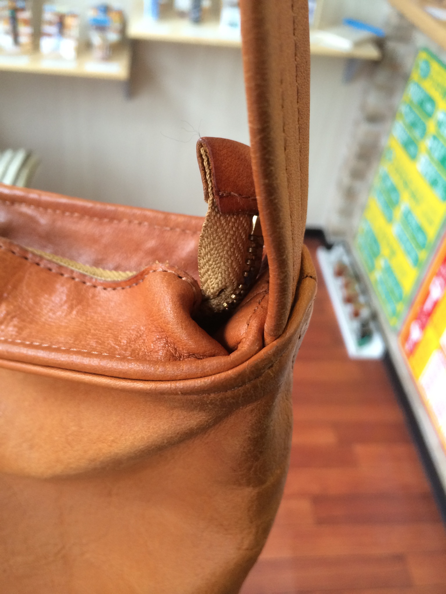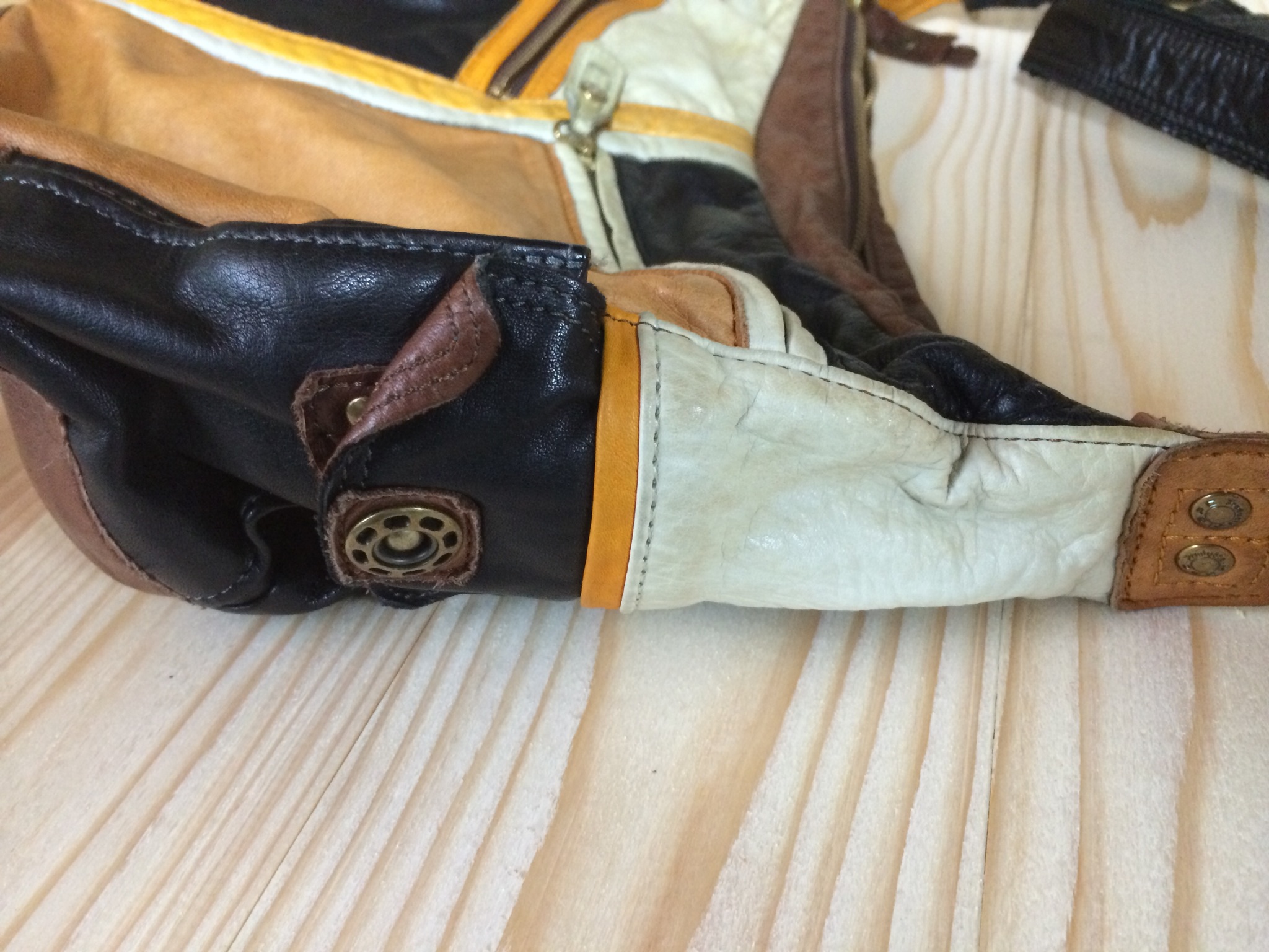 このバッグは肩紐の長さ調整も縫いを解いてしています。