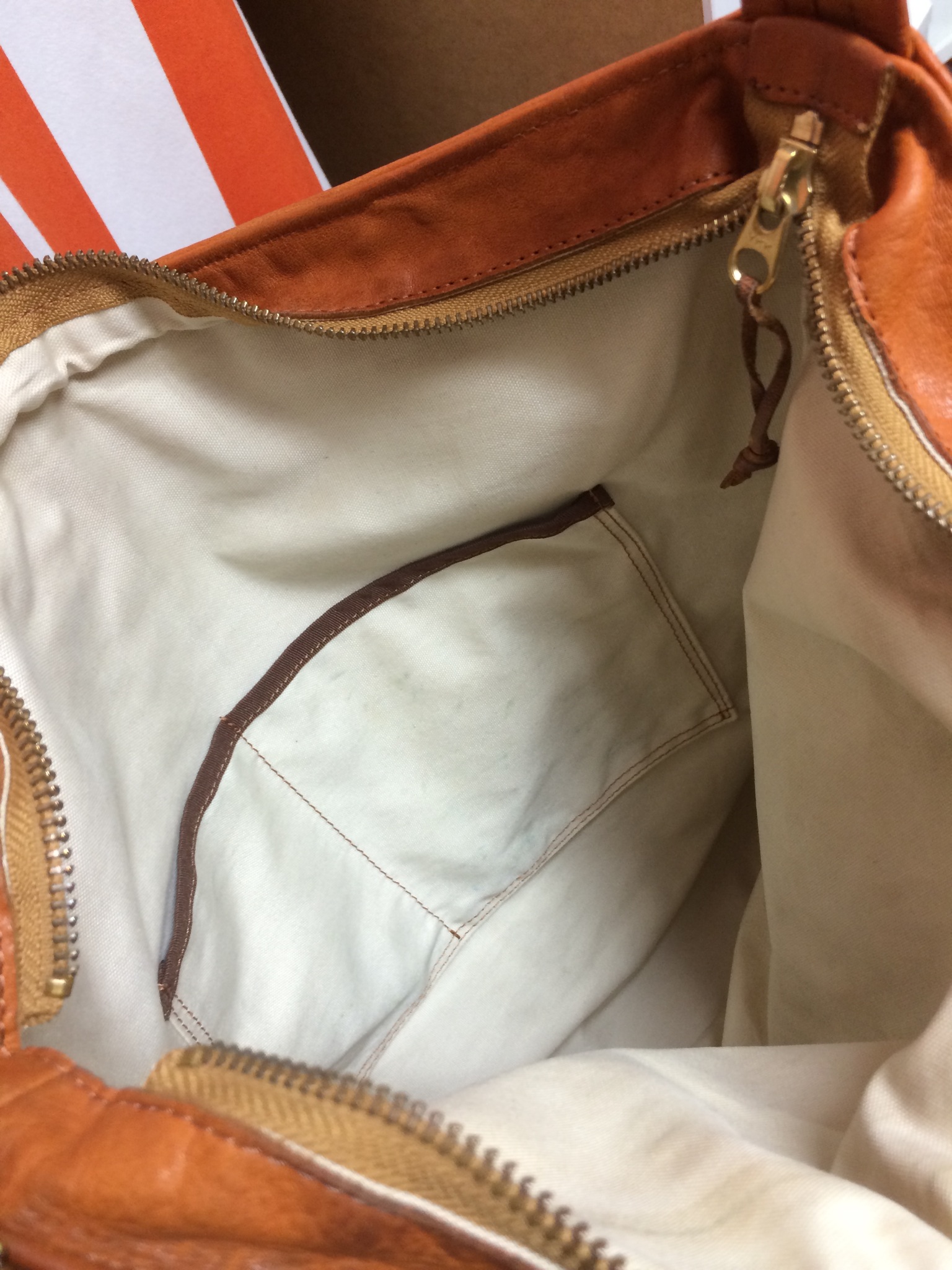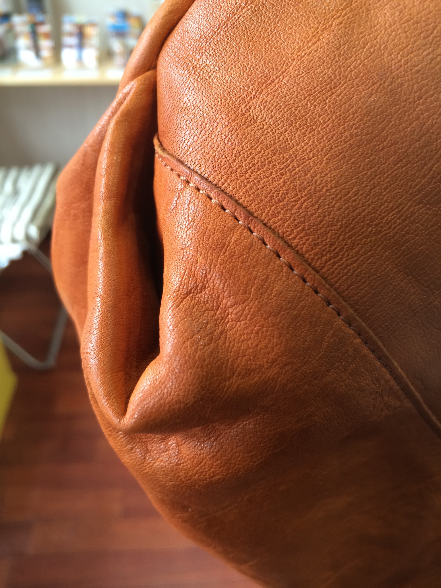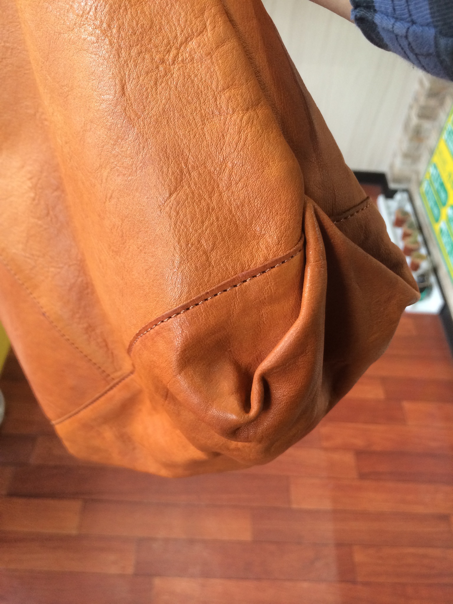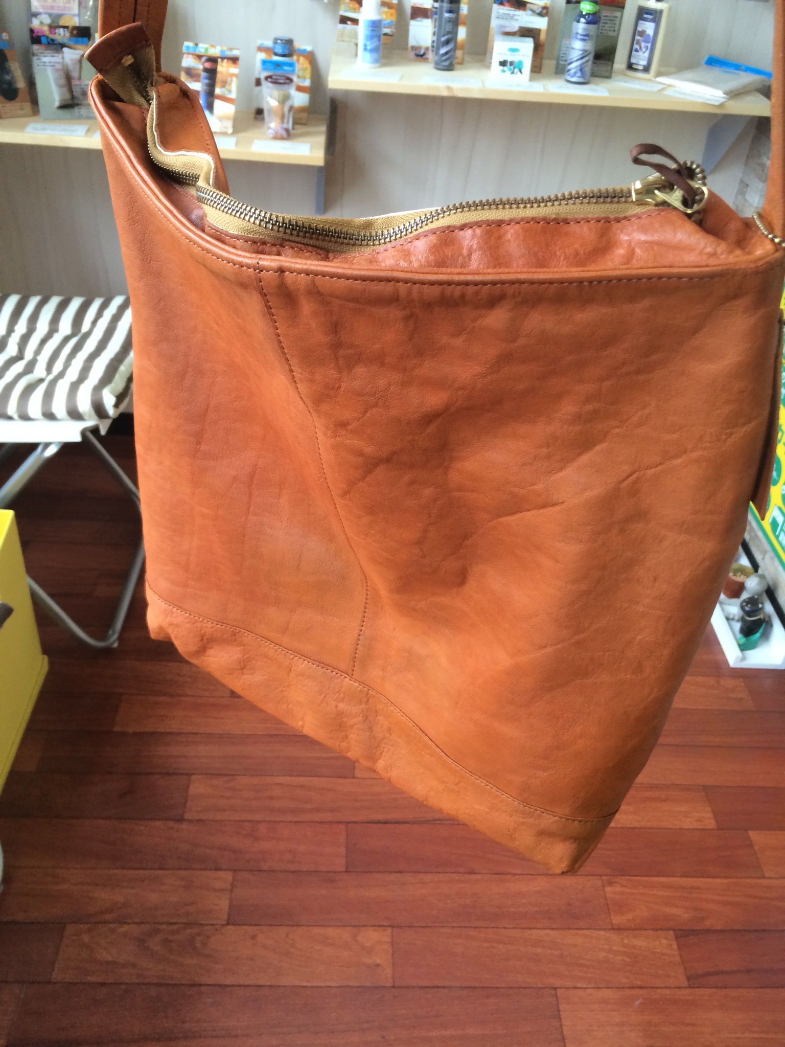 このバッグは室外と室内で革の表情(見た時の色味)変わるので、