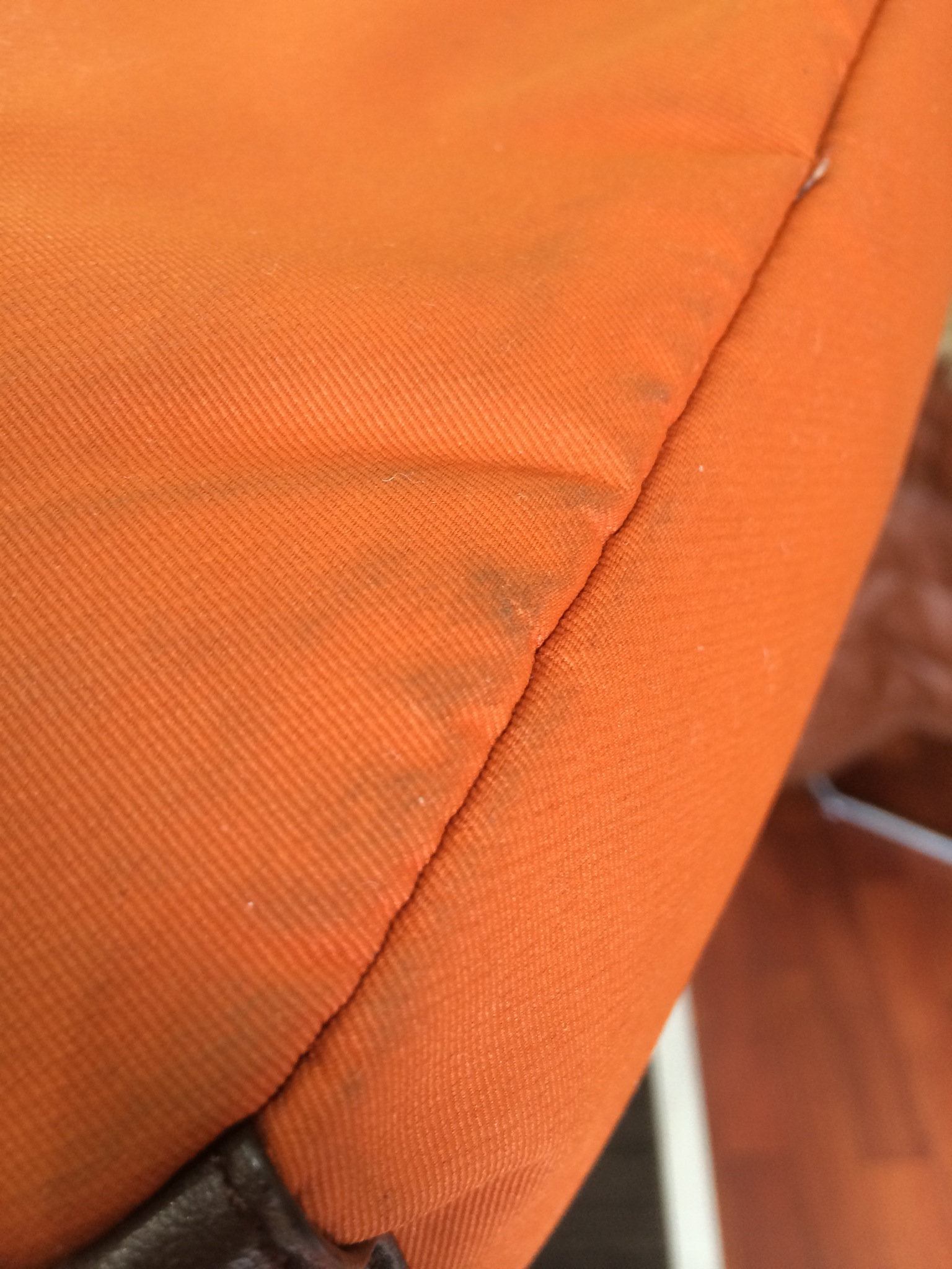 慎重に慎重に、ピンク革の汚れをゴシゴシしていきます。今回茶色の部分はキレイなのでなにも致しません。