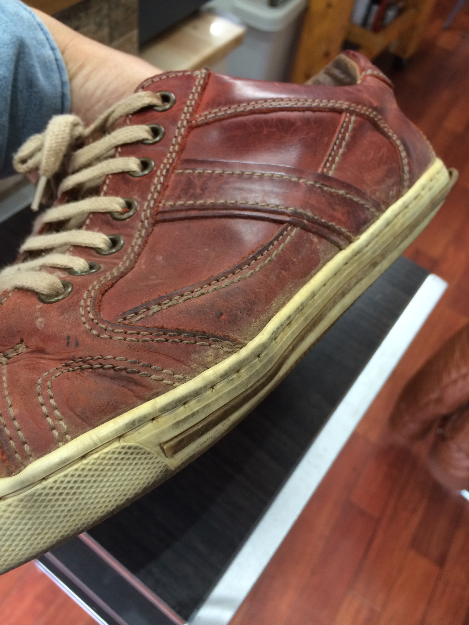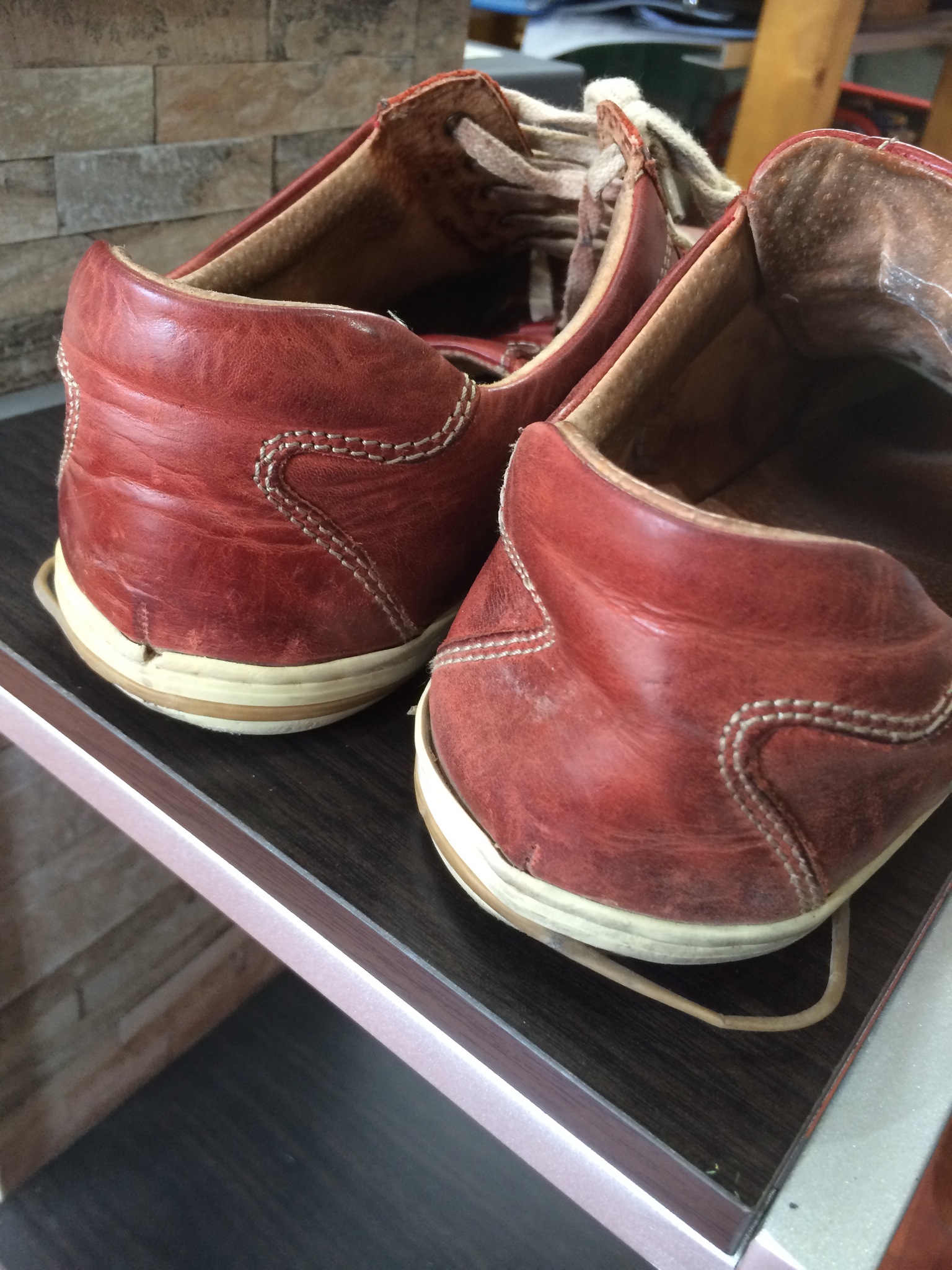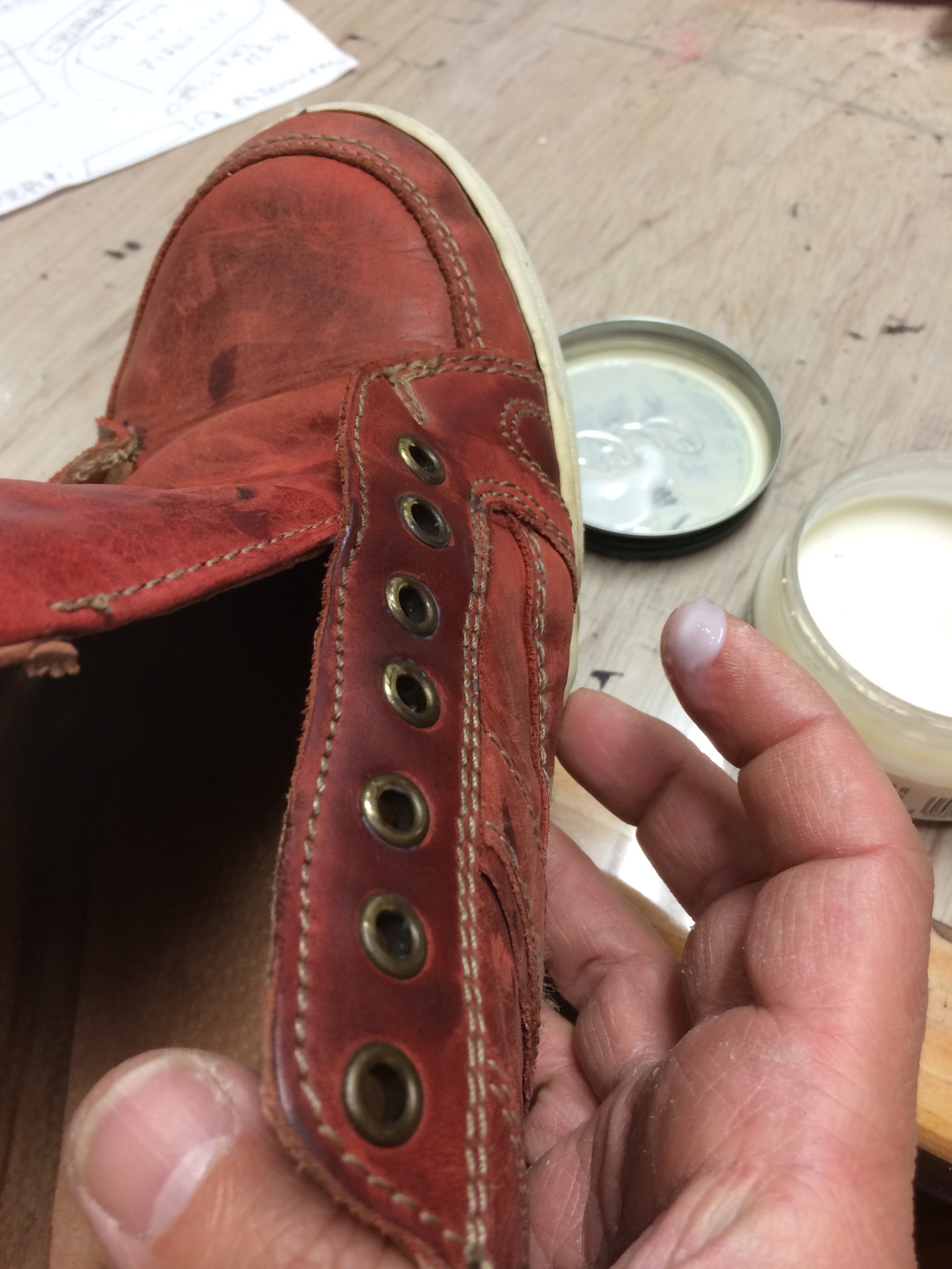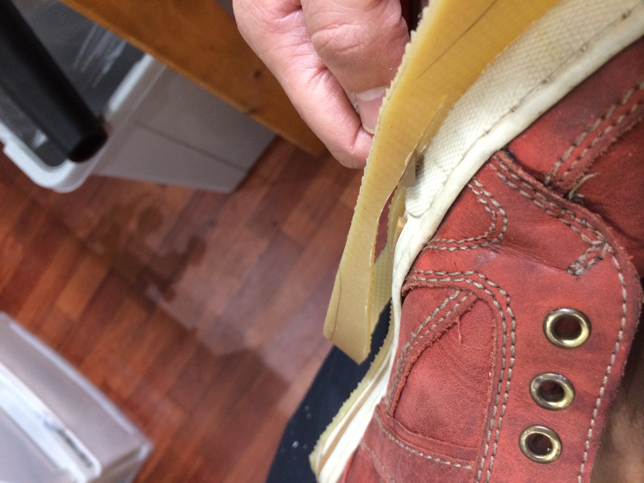 履き口の止め金具が外れているので、ここを直していきます。