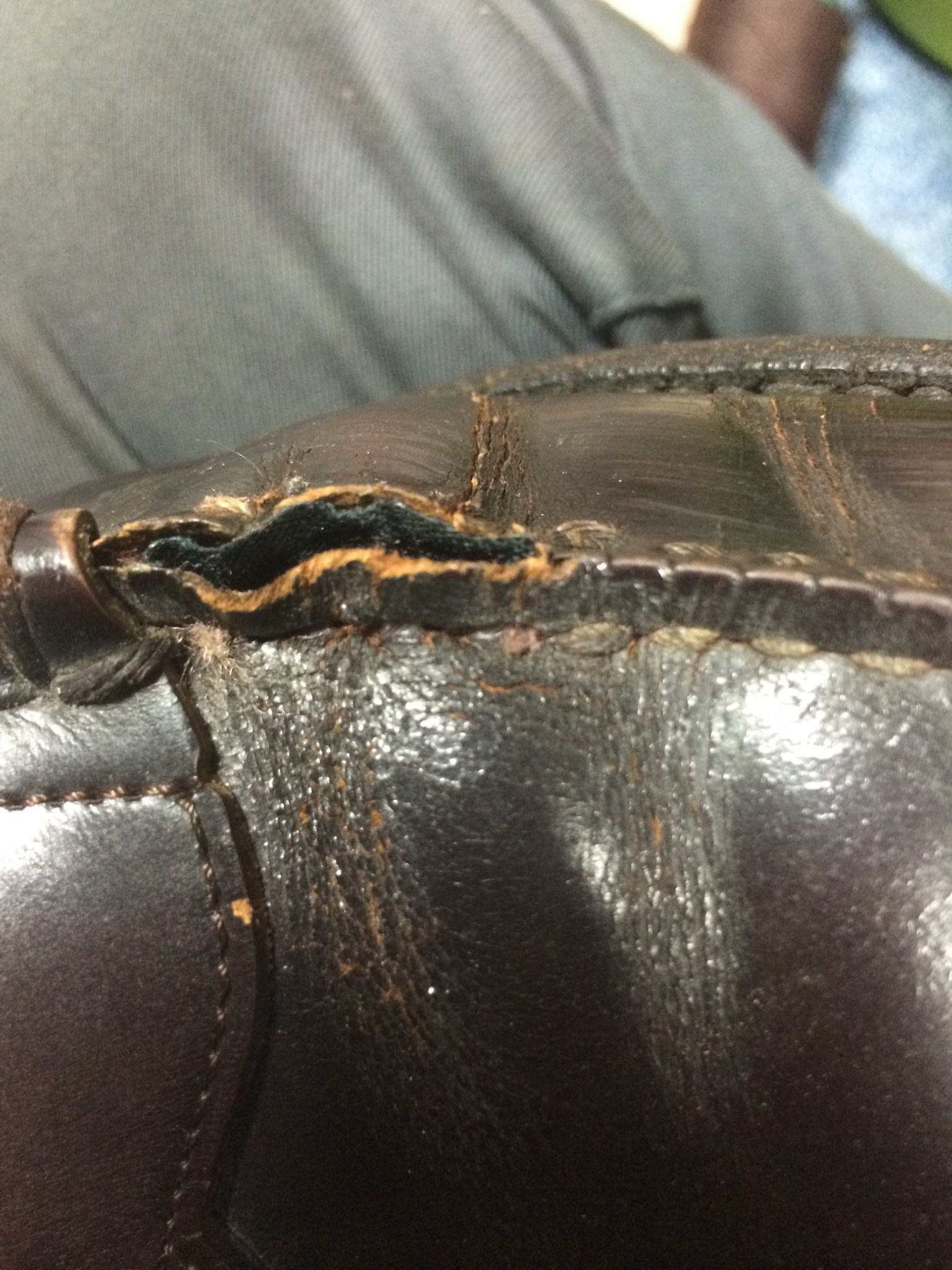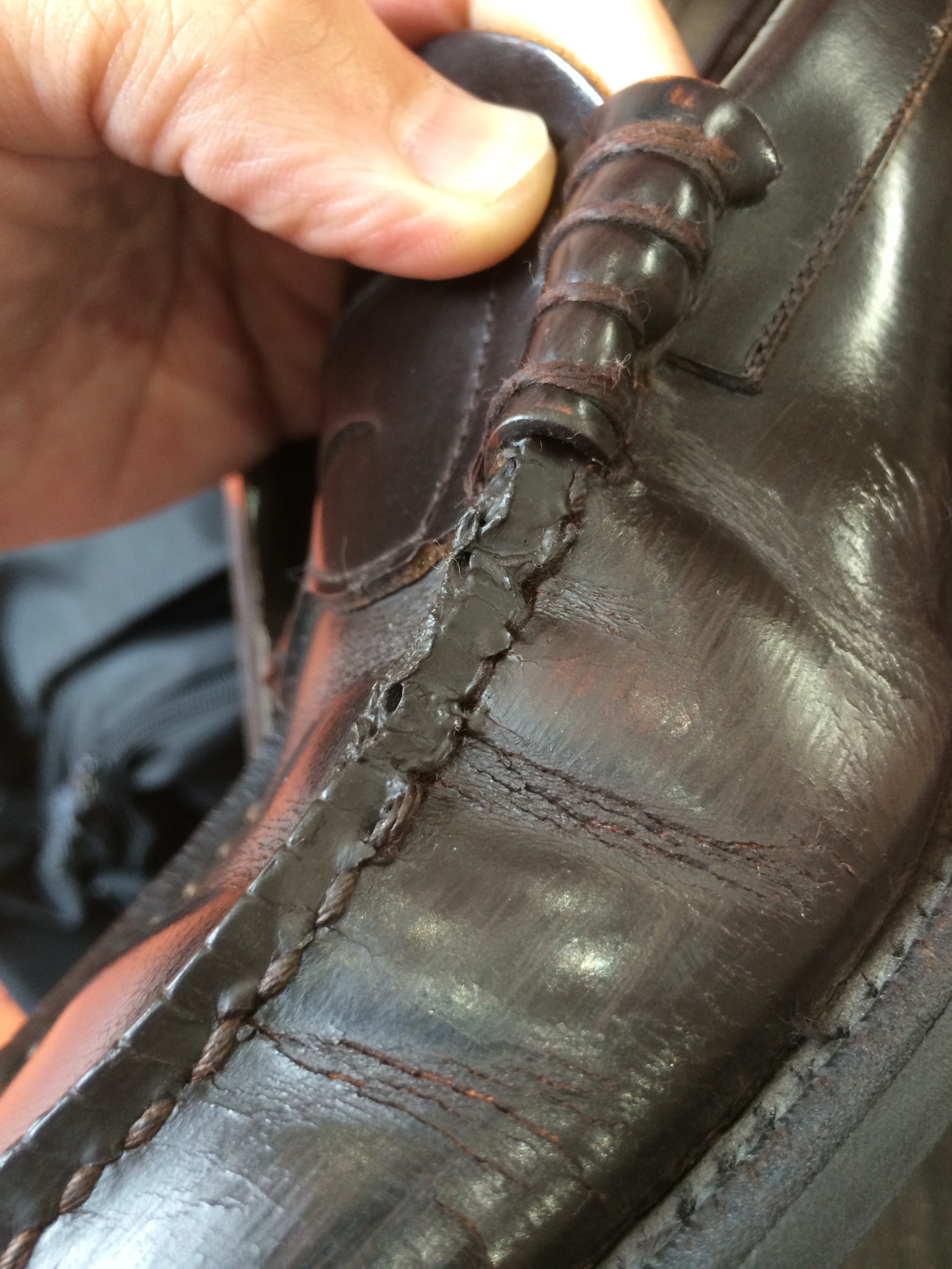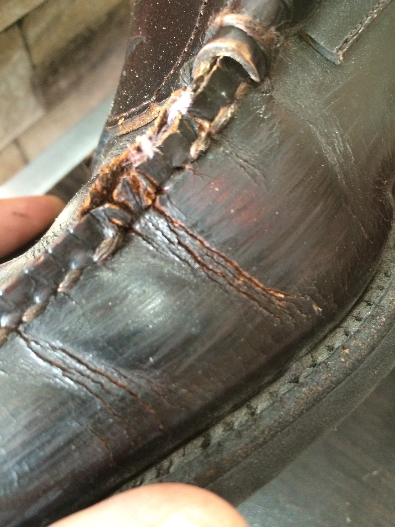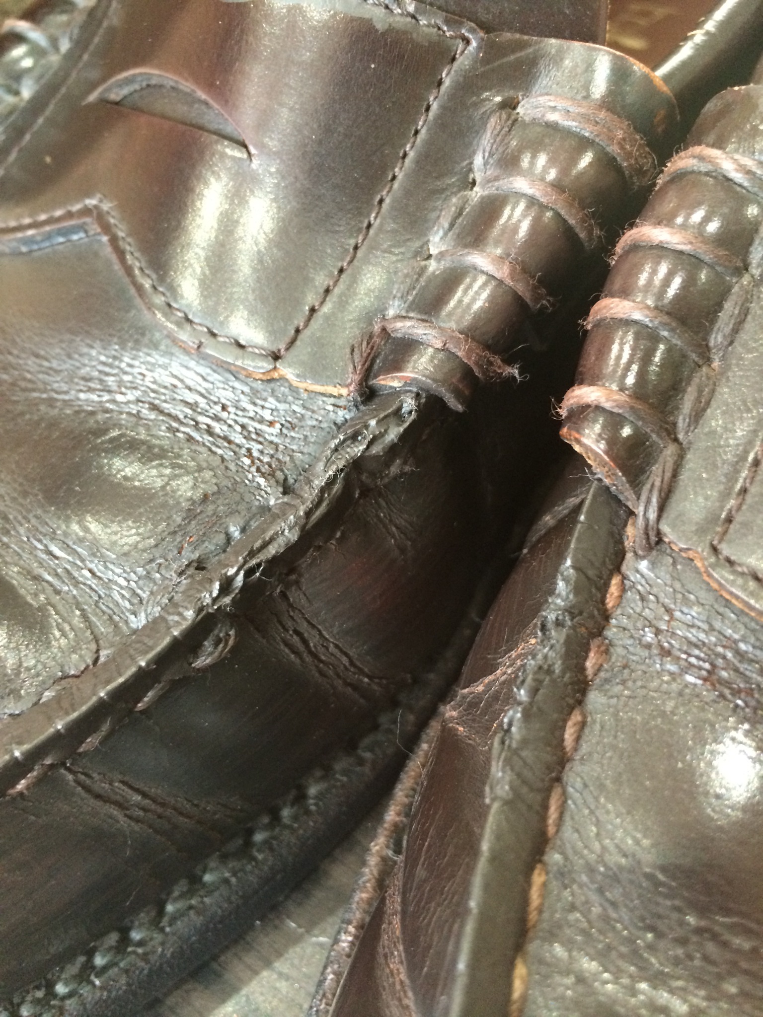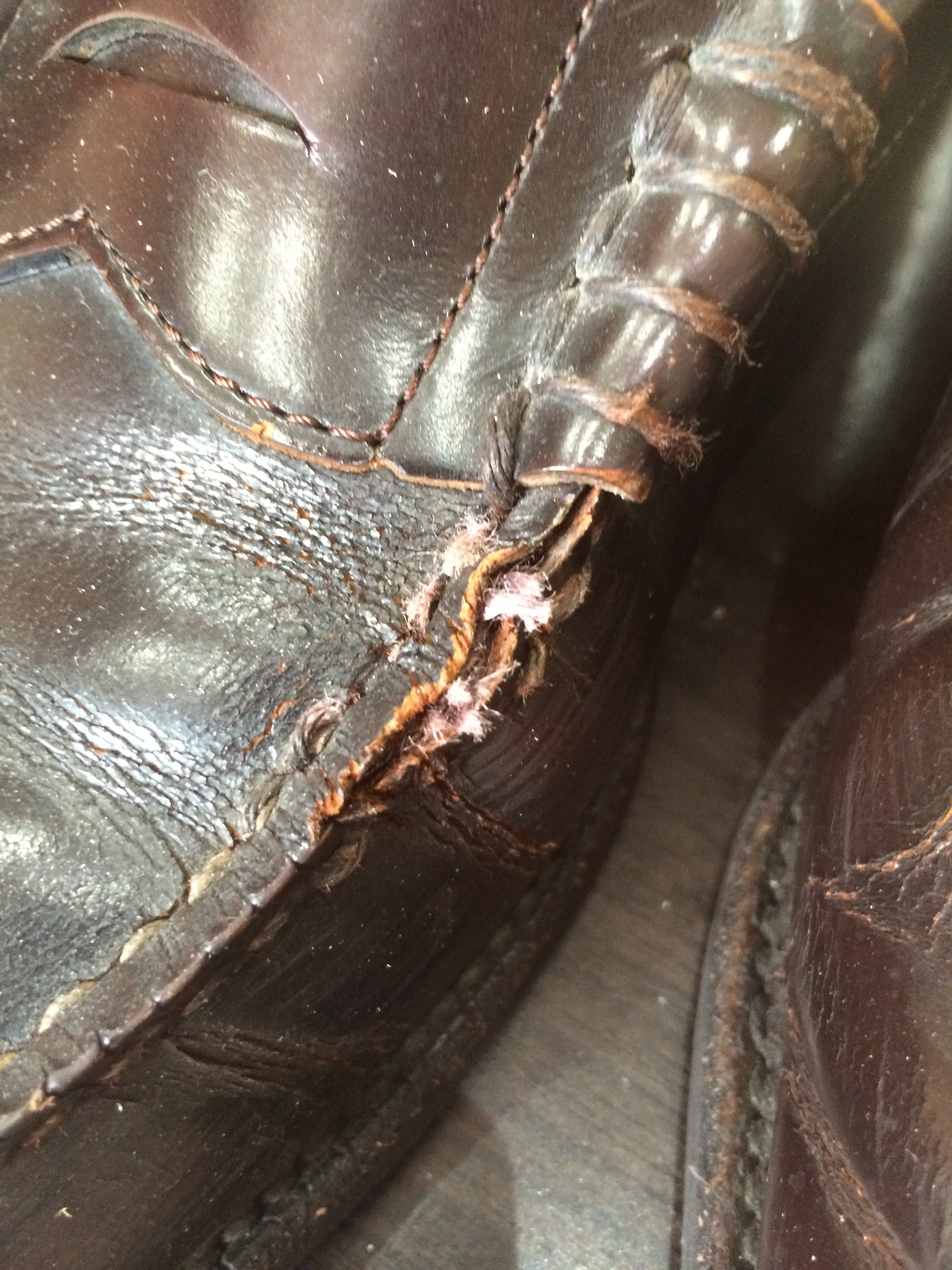 ↑革が固まって、ひび割れになり、糸がほつれてきています。