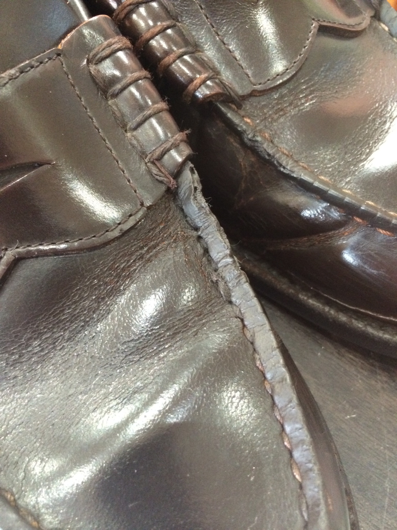 アッパーの革が裂けているので、リーガルに持って行っても修理は不可とされます。