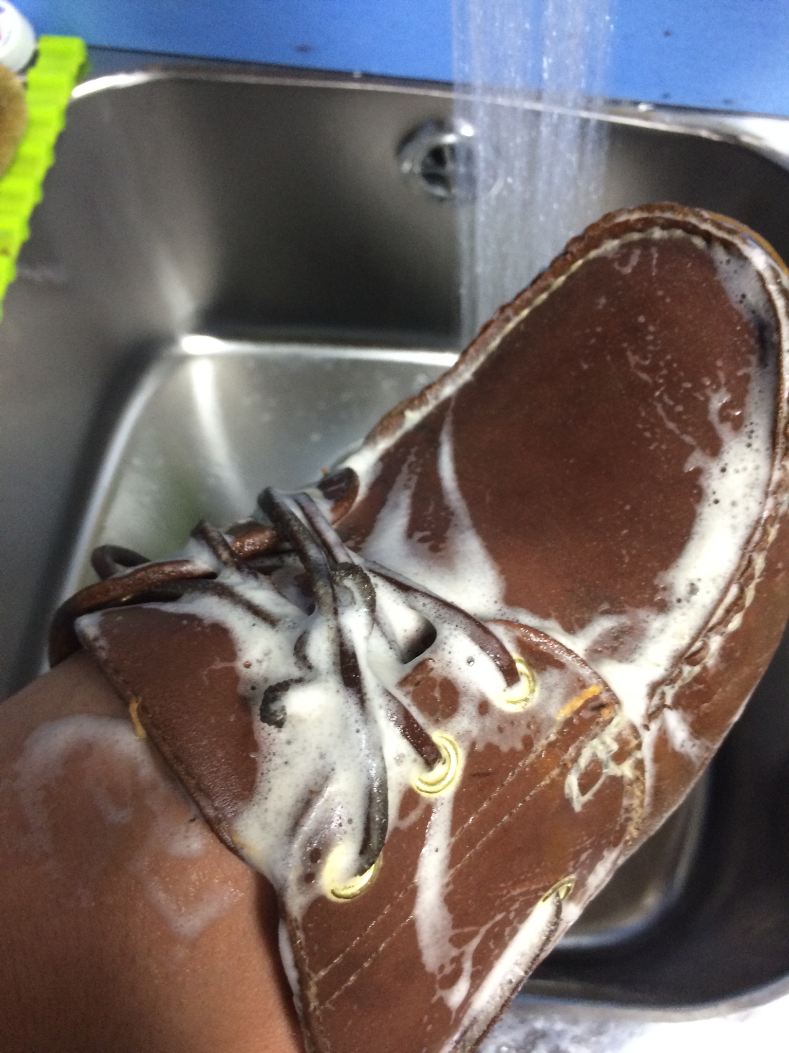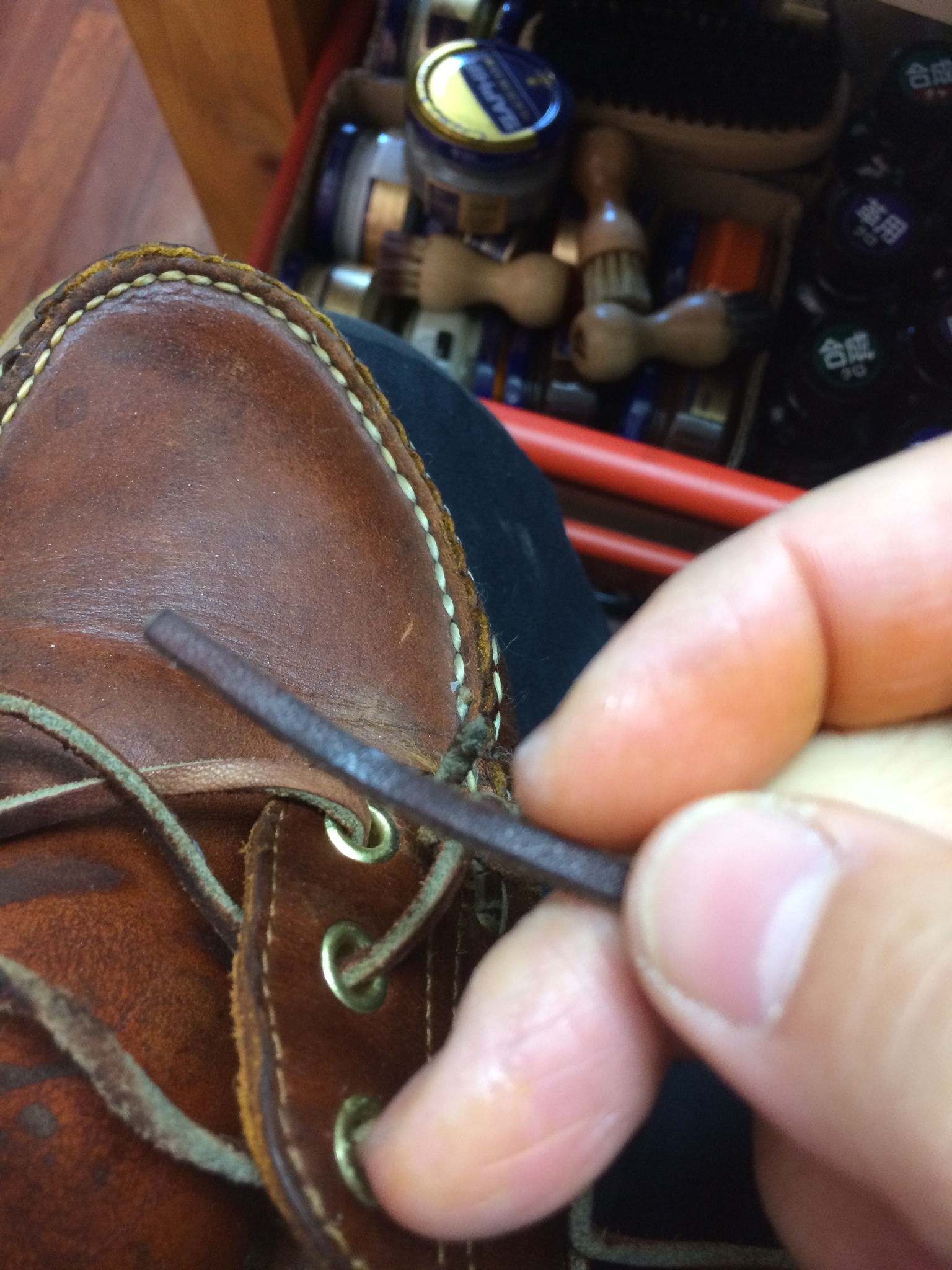 通常クリーニング時は靴ひもは外しますが、こちらの靴の場合革ヒモが途中て切れて堅結びしてるので