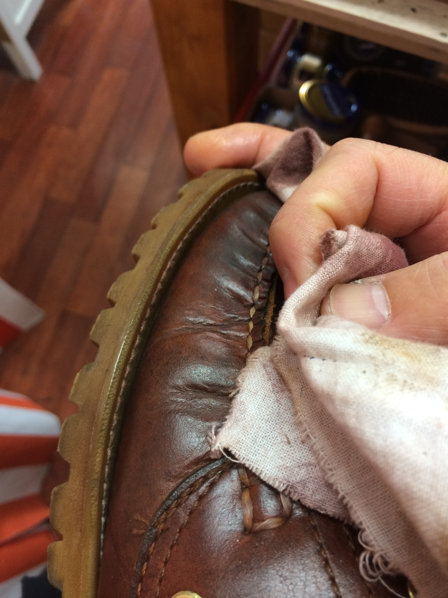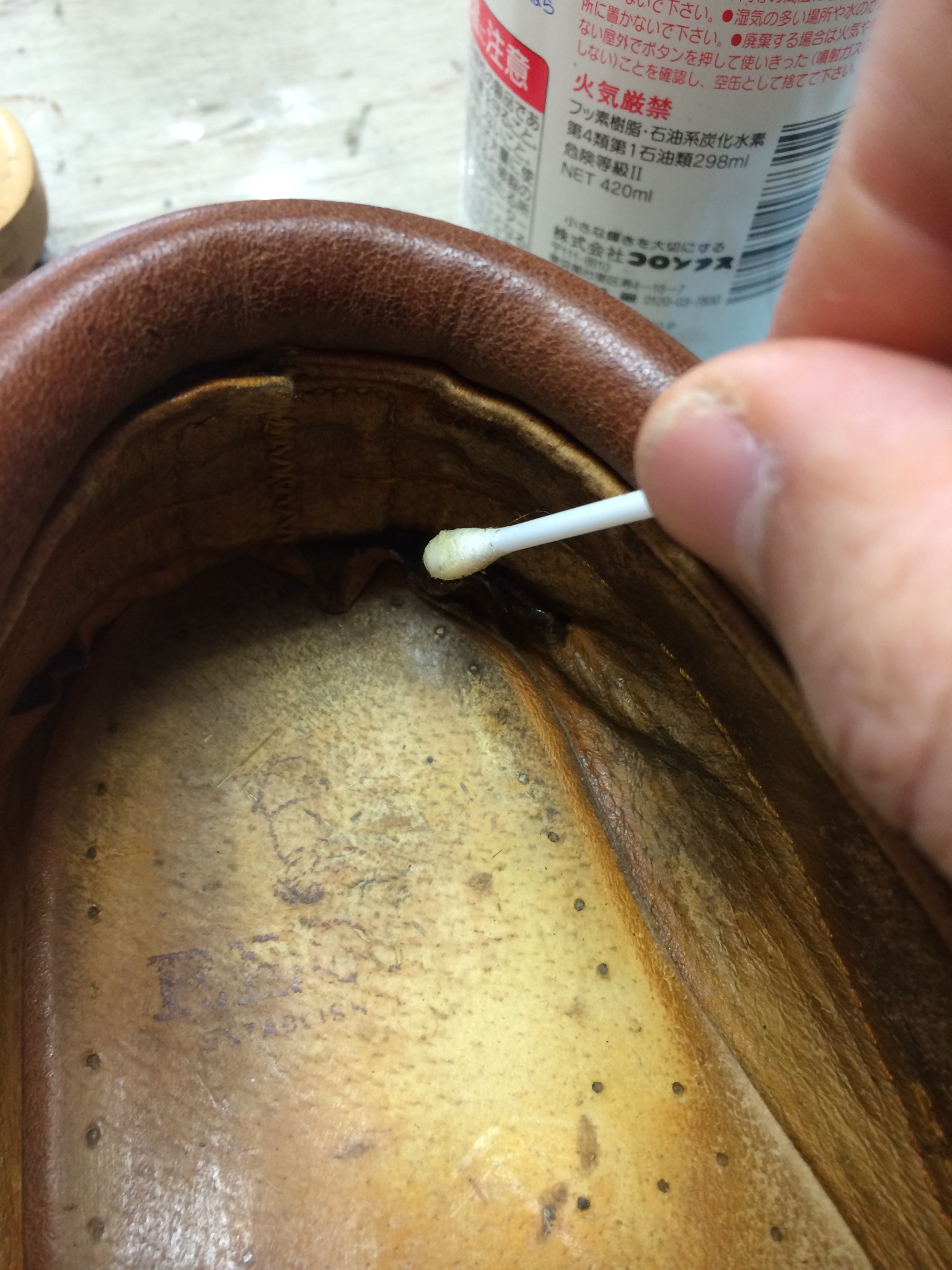 ベロの部分や中敷き(ここも革です。見落としがち)、靴ひもも革だから塗っていきます。