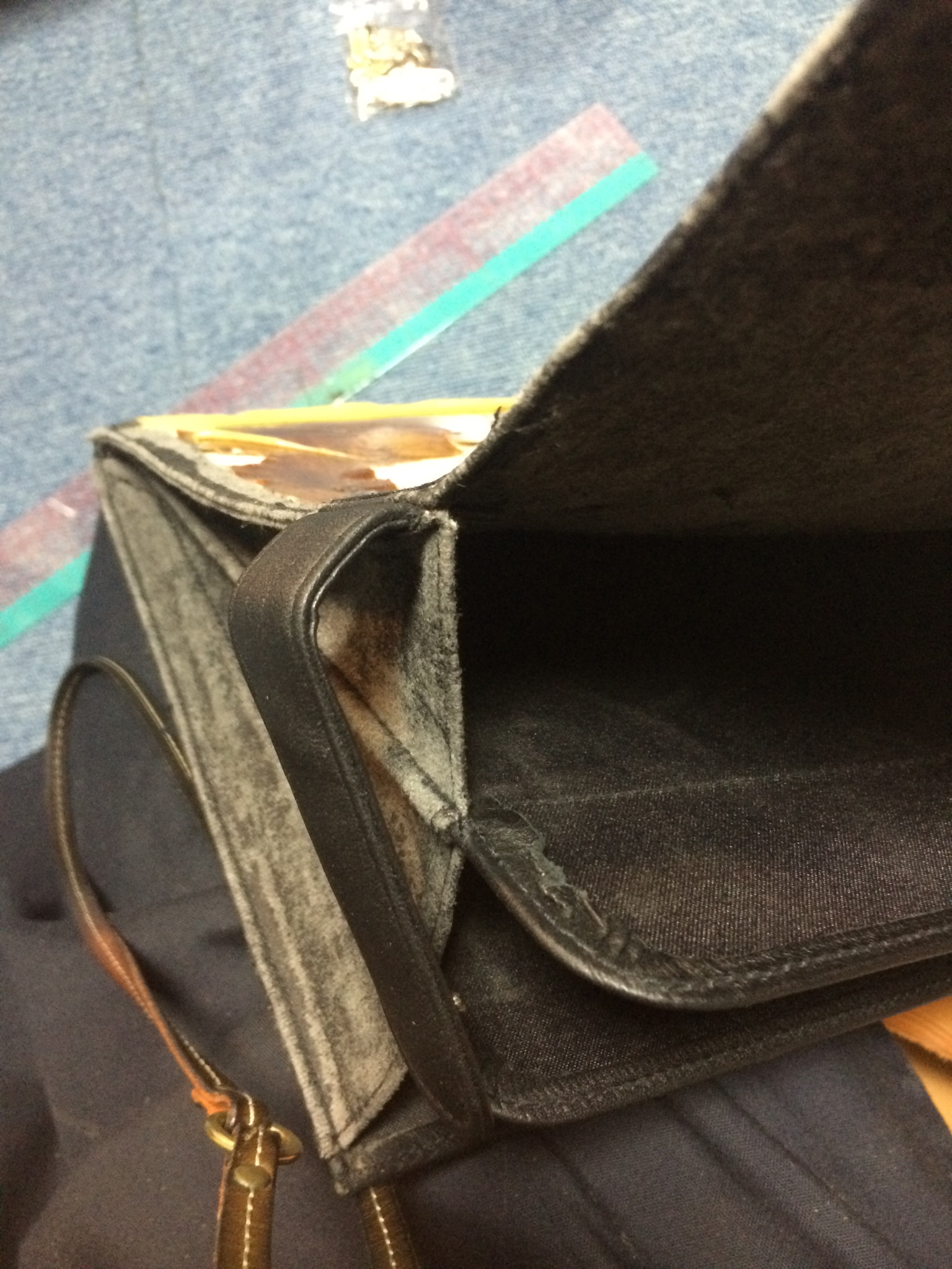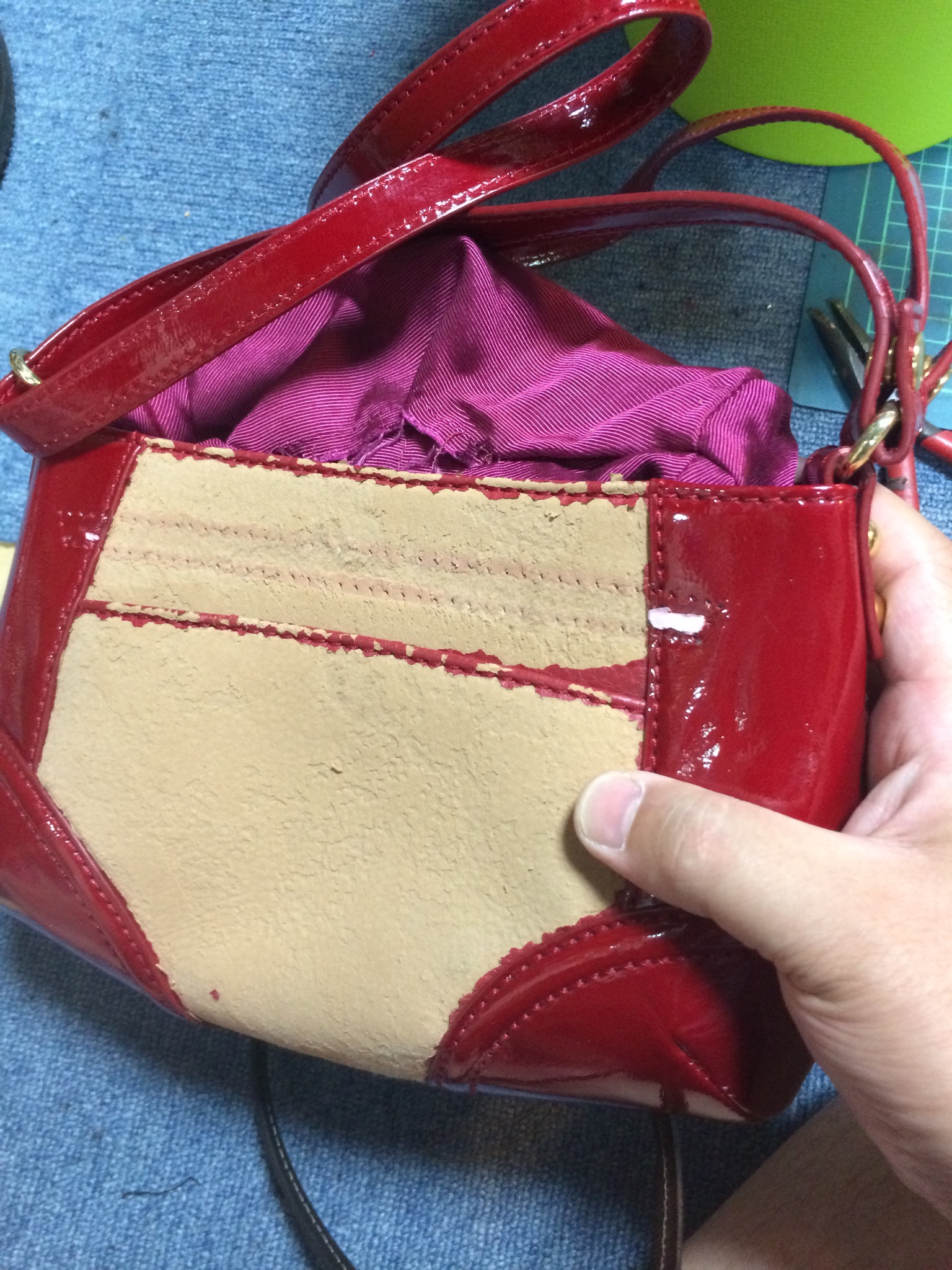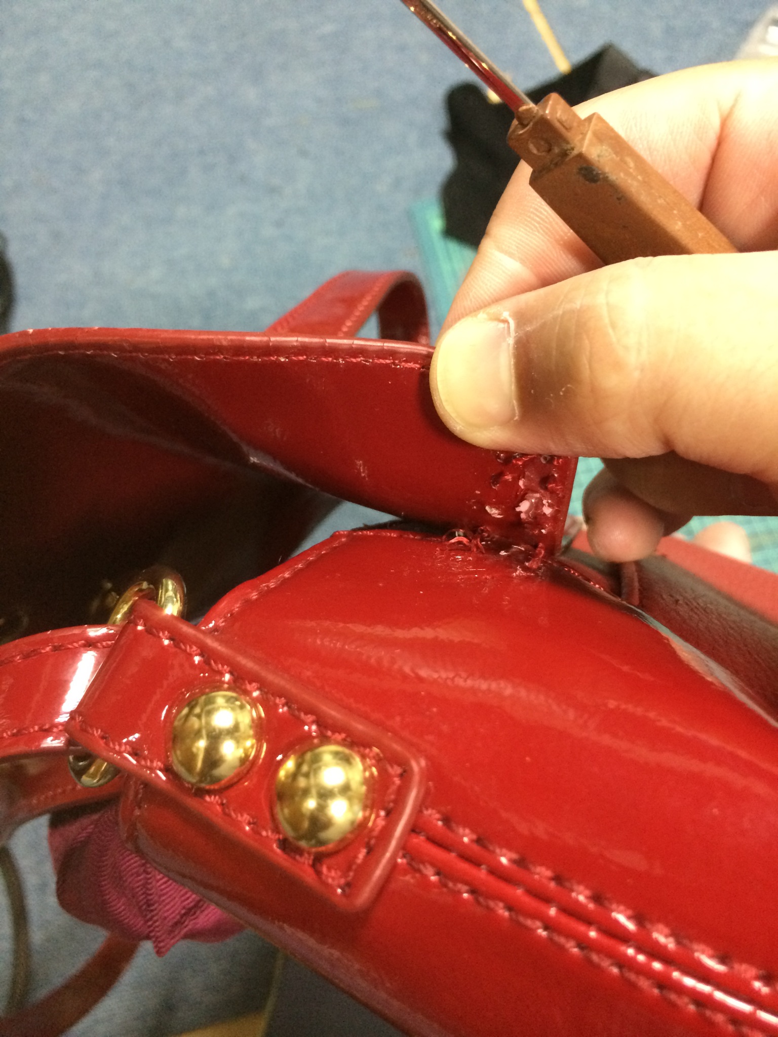 今回の修理法はバッグは解体せずに、合皮の上から本革を接着と縫いで