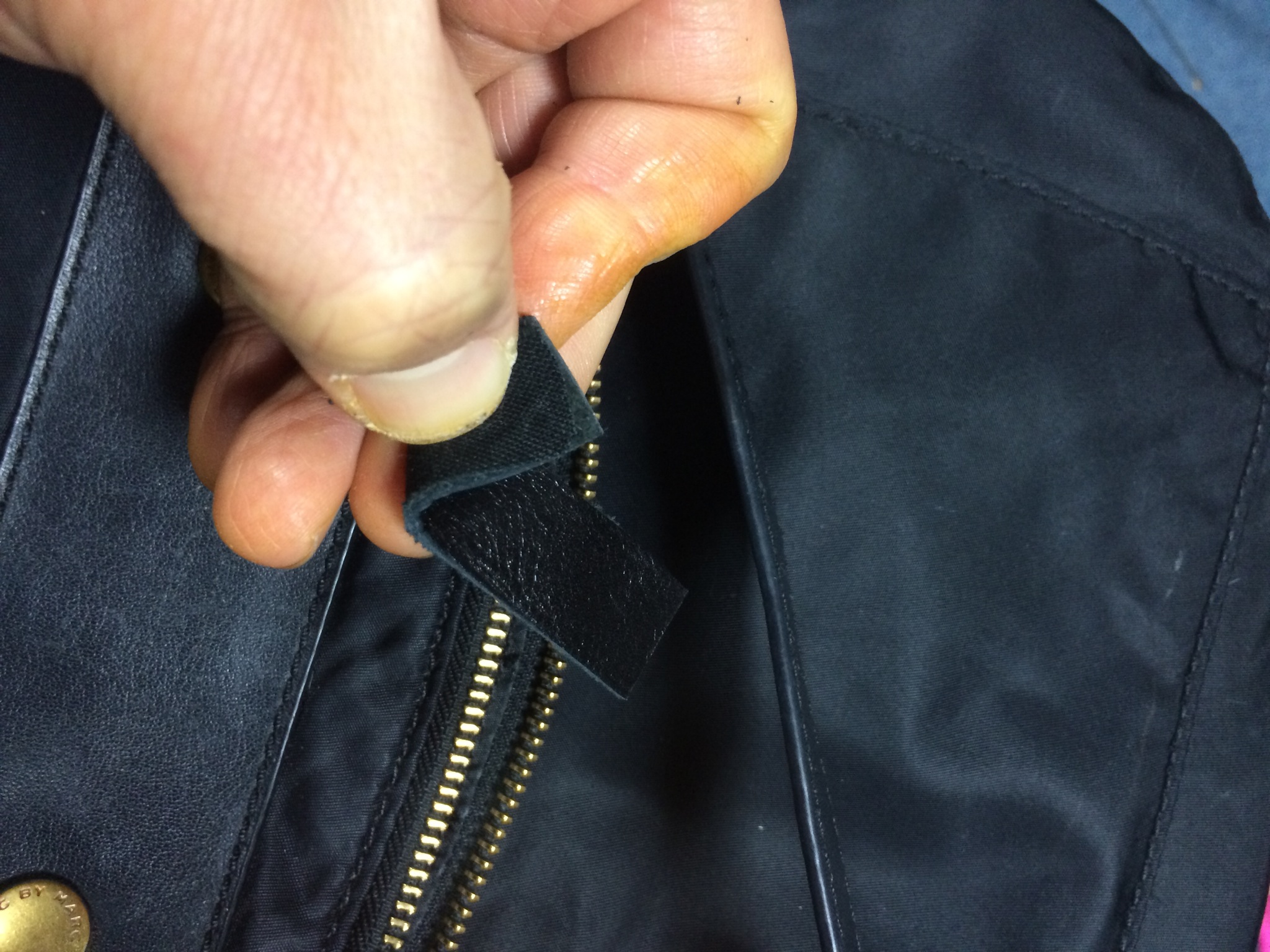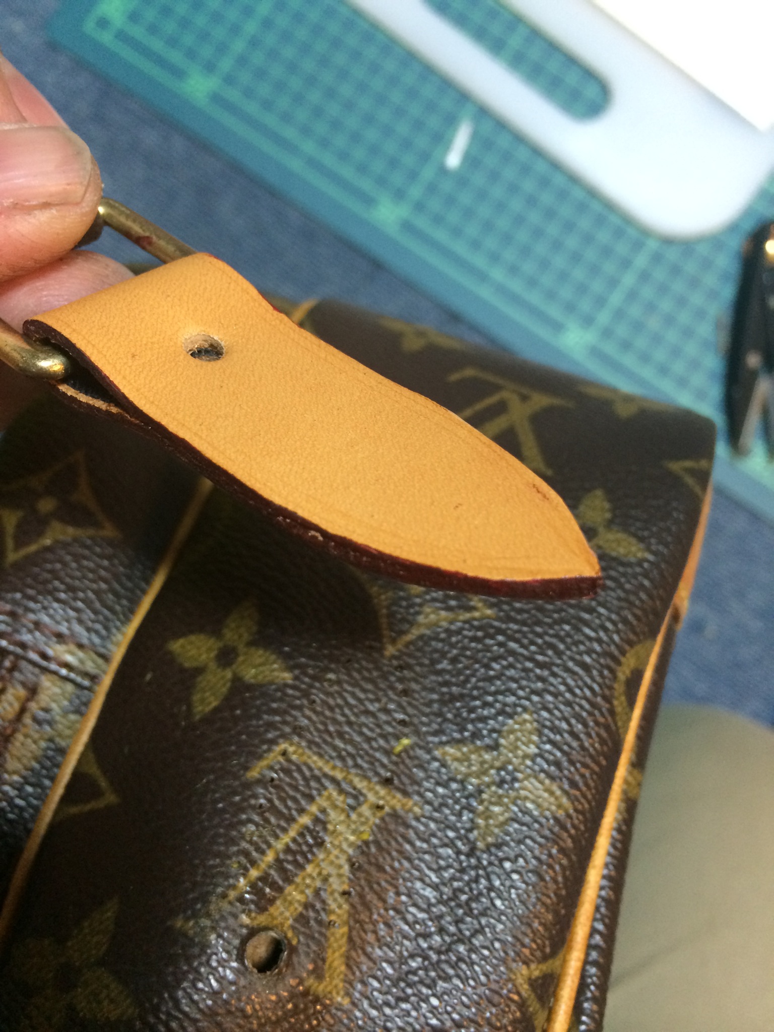 補強テープ付けた革を使い修理します。