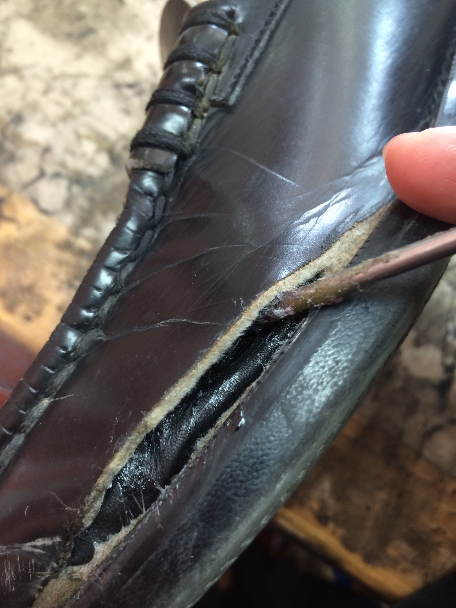 左足だけですが、革が裂けているので縫いを外して補強修理します。
